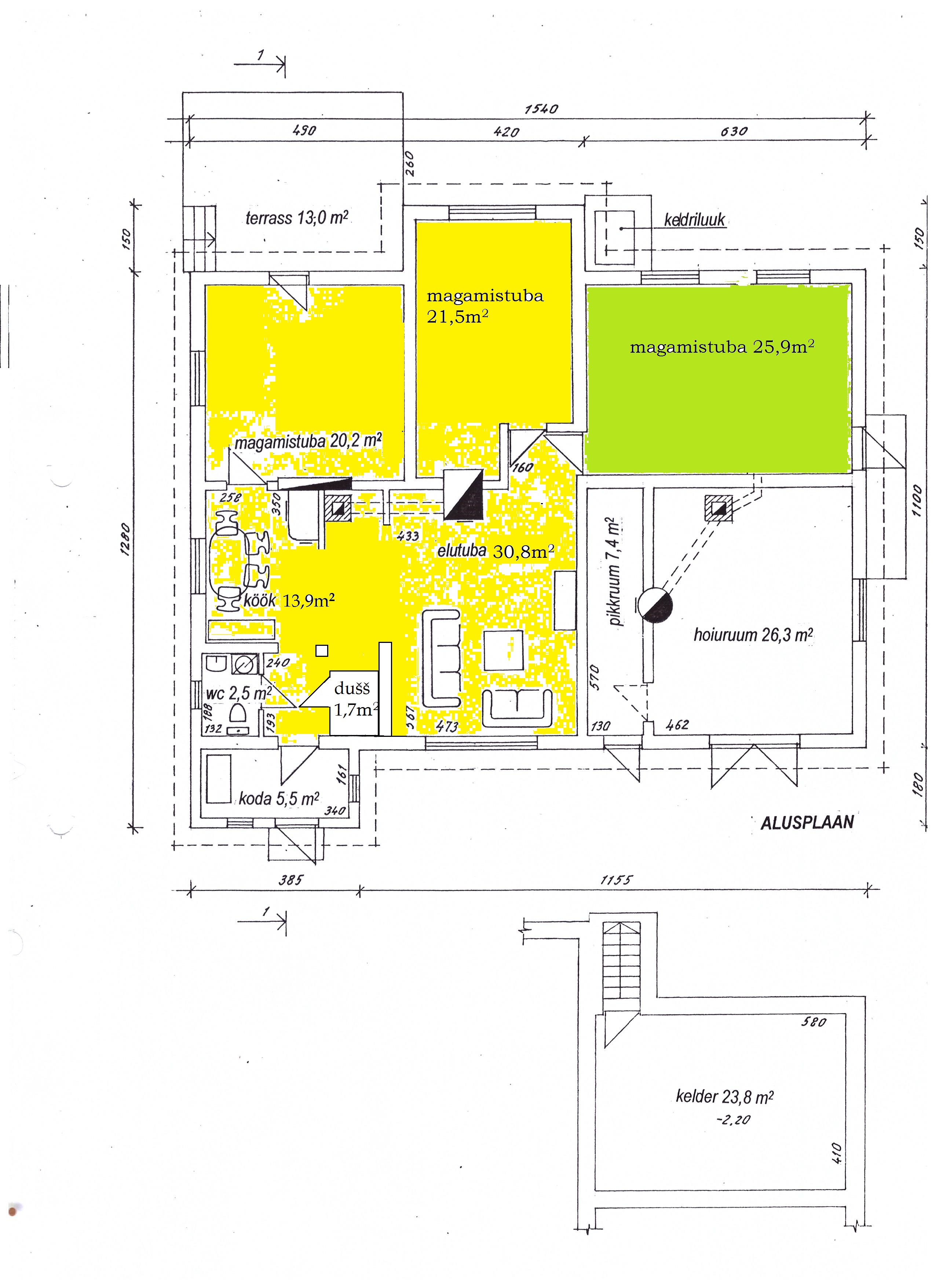 Rohelisel alal on hetkel põrandaks betoon, mille all asub kelder. Hanke korraldaja paigaldab rohelisele alale penoplasti. Kollasel alal eemaldab hanke korraldaja ise vana põranda kuni mulla pinnaseni.