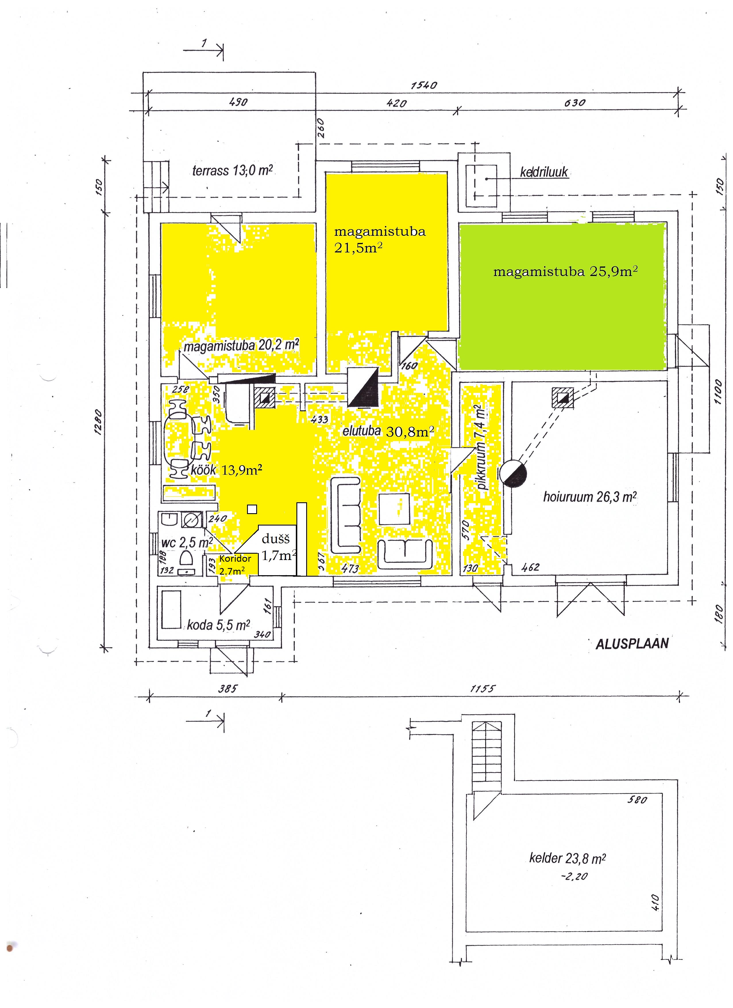 Kollasel alal eemaldab hanke korraldaja ise vana põranda kuni mulla pinnaseni. Rohelisel alal on hetkel põrandaks betoon, mille all asub kelder. Hanke korraldaja paigaldab rohelisele alale penoplasti.