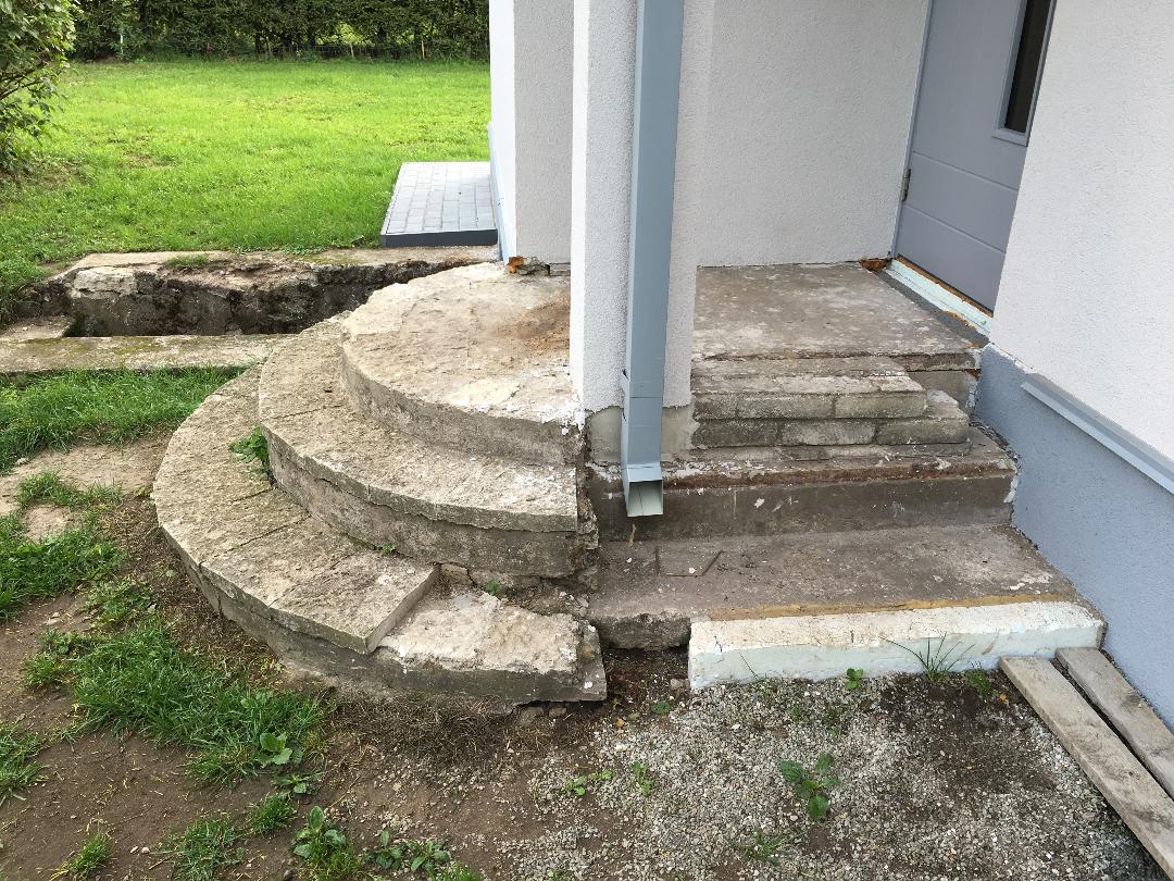 Vana trepp jääb enamuses osas alla, osaliselt on vaja alumine vana aste maha piigata ning samuti vana trepi pealmisest osast on vaja 5-10cm maha piigata, et pesubetoon plaadi paigalduse järgselt uks avaneks.