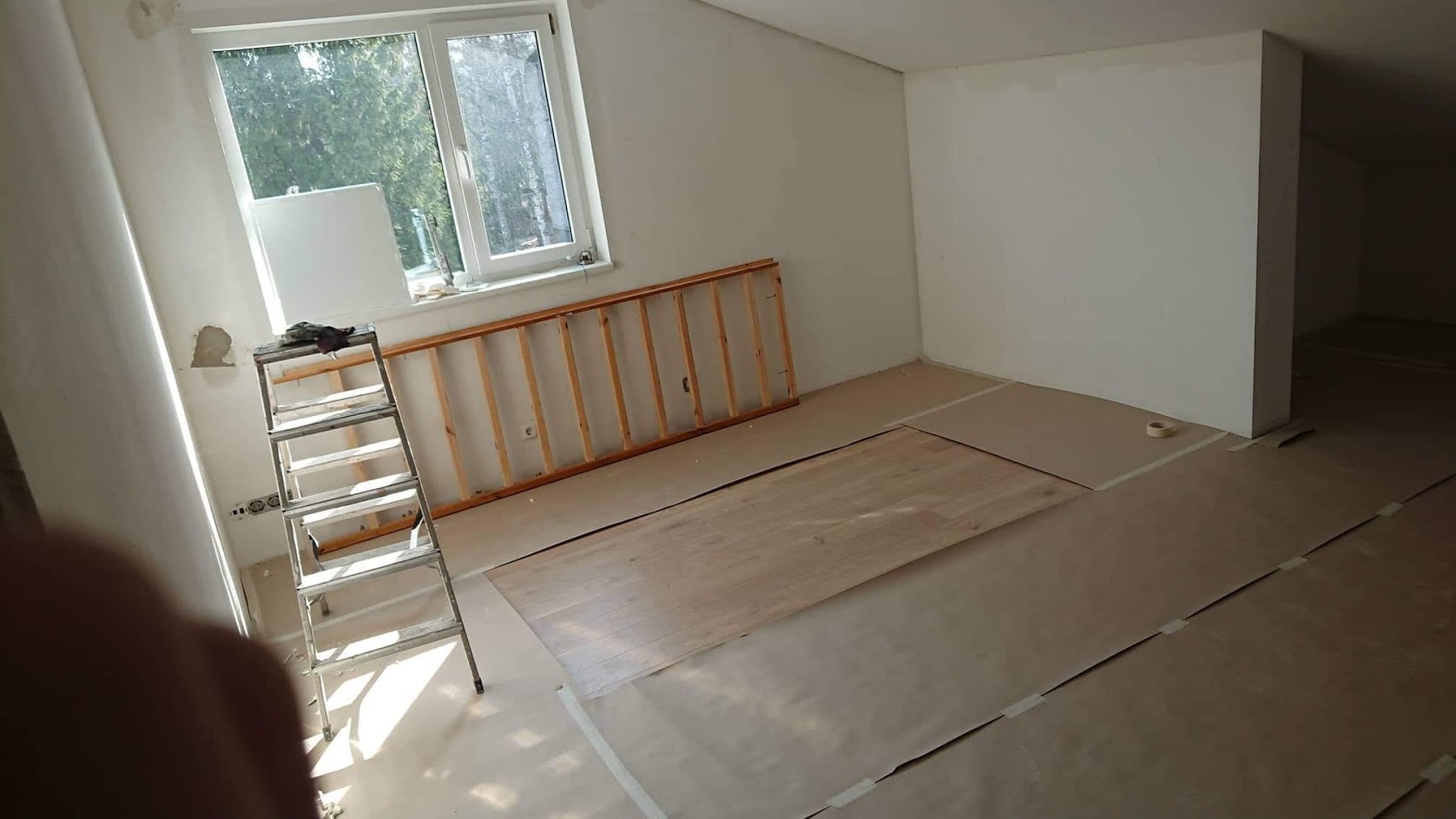 Oleks vaja seinad ette valmistada (pahtel + lihv + krunt) lõppvärvimiseks. Ettevalmistatud kipsseinad. Tegemist elamu magamistoaga. Põrandapind 29,8m2. Lae kõrgus sissepääsust 2,5m, vastassein 1,2m.