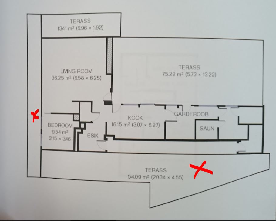 Varasemalt puitterrassi all olnud ala tuleb asendada tänavakiviga. Joonisel toodud punase ristiga märgitud alad. Kokku ca. 66-67 m2.