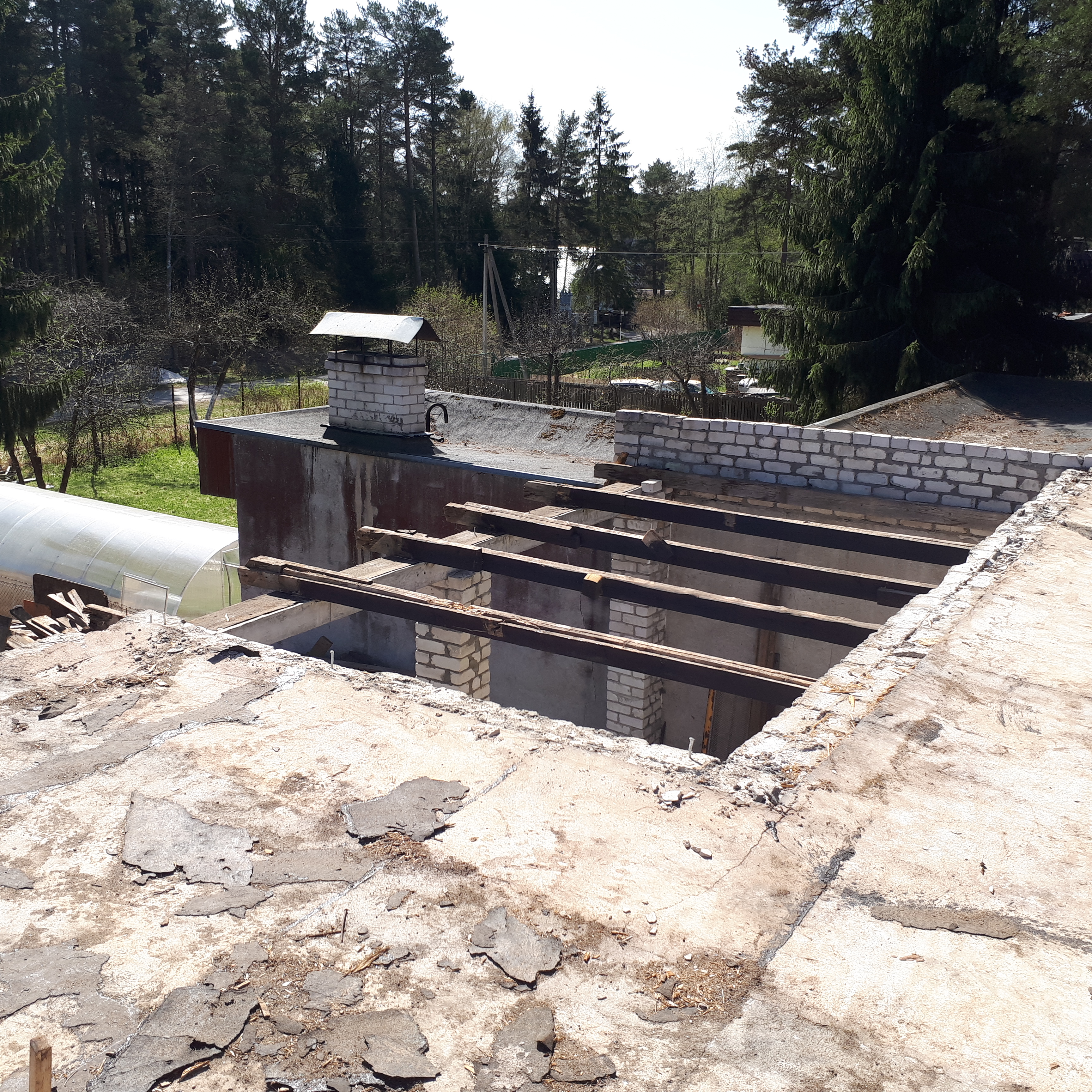 Eramaja, Tegemist on vana ühekorruselise majaga, L-tähe kujulise katuse aluseks on õõnespaneelid, 120 m2, Katuse parapetid silikaattelliskivist on tehtud ( 5 telliskivi kõrgusega) Korstnaid ei ole.