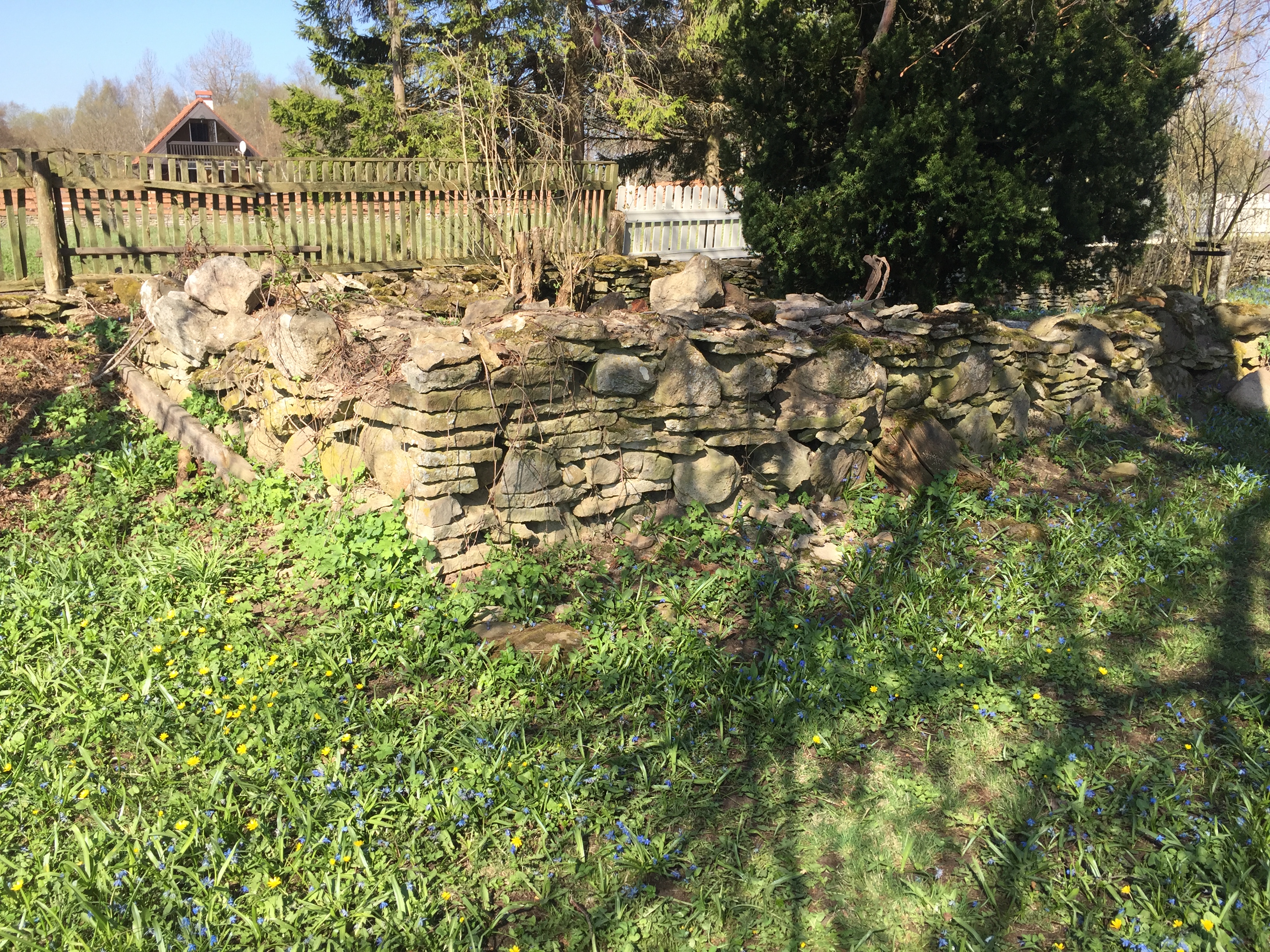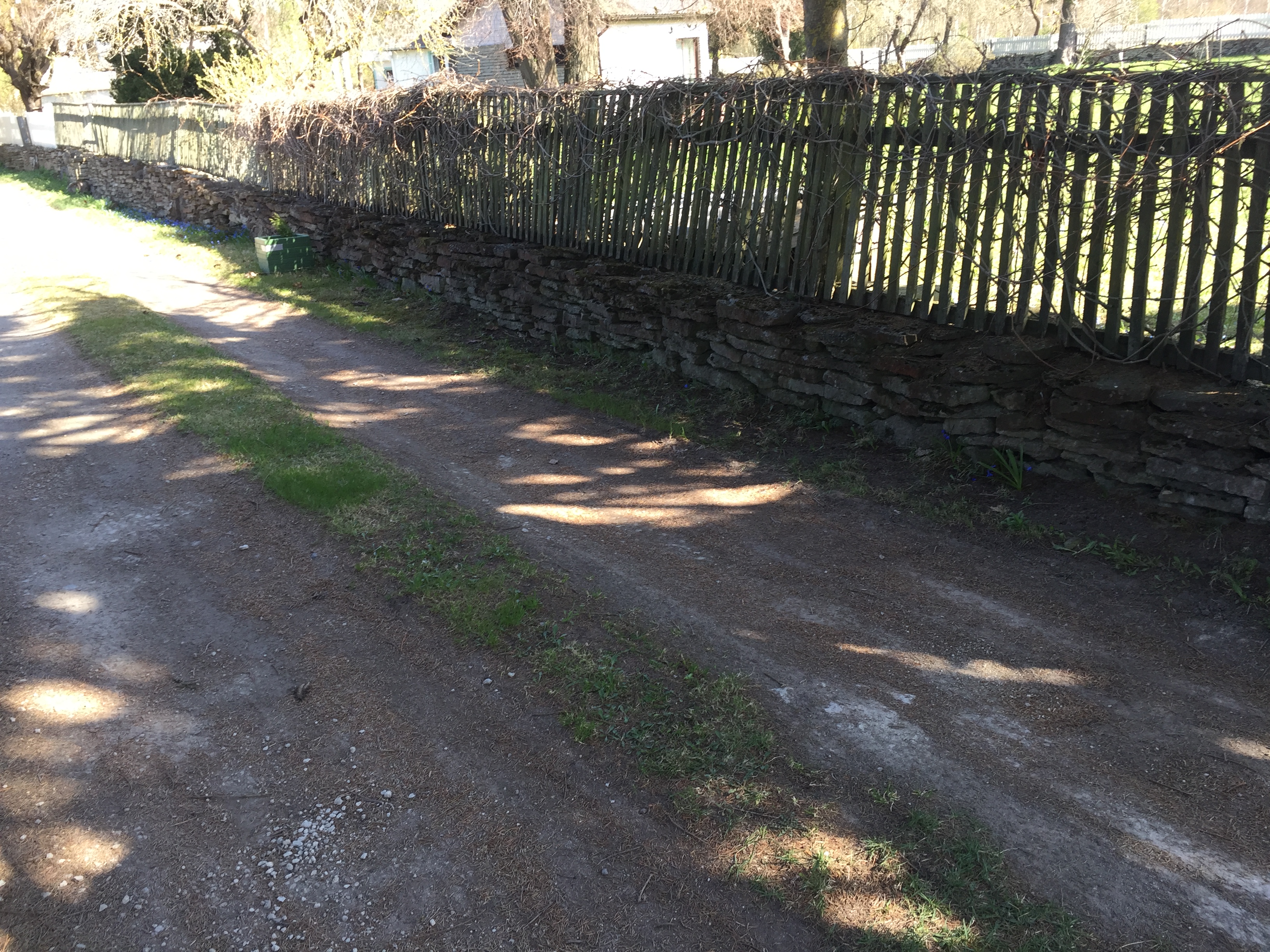 Vaja taastada 34 m längu vajunud paekiviaeda (pilt 1) ja selle peale ehitada lattaed. Aia laius 60 cm, kõrgus 70 cm. Puudujäävad kivid tuleks võtta vanast müürivaremest (pilt 2). Aias on lisaks paekividele ka üksikuid maakive.