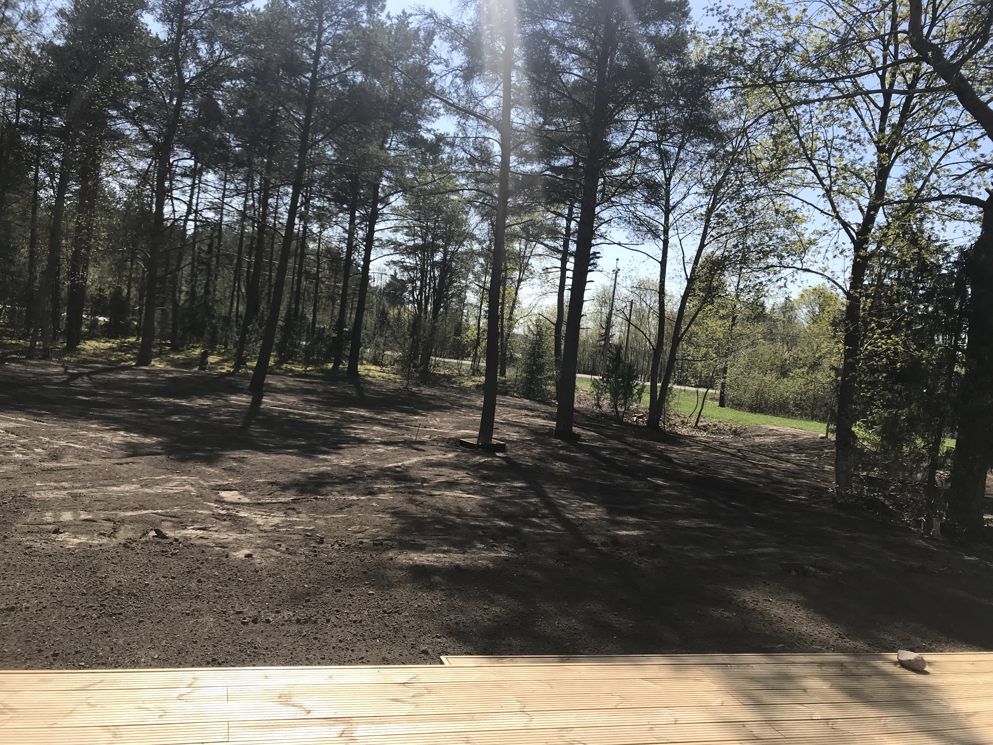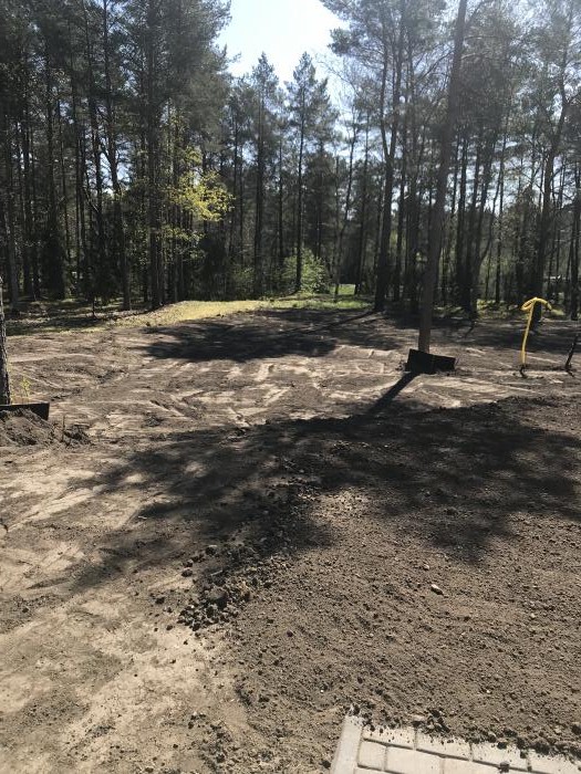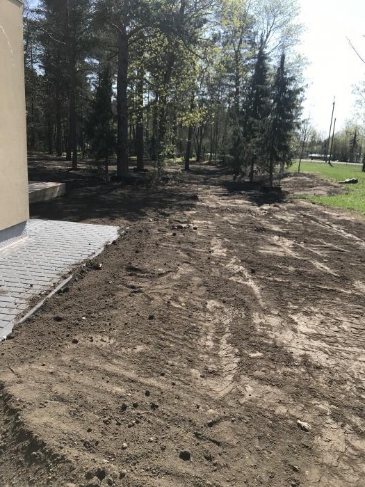 Pinnase ettevalmistamine muru külvamiseks (suuremad kivid ära korjata ja oksad, mis kopa tööst jäänud maha, rehaga äärekivide juurdest muld tasasemaks tõmmata. Pind tasandatud ja planeeritud.