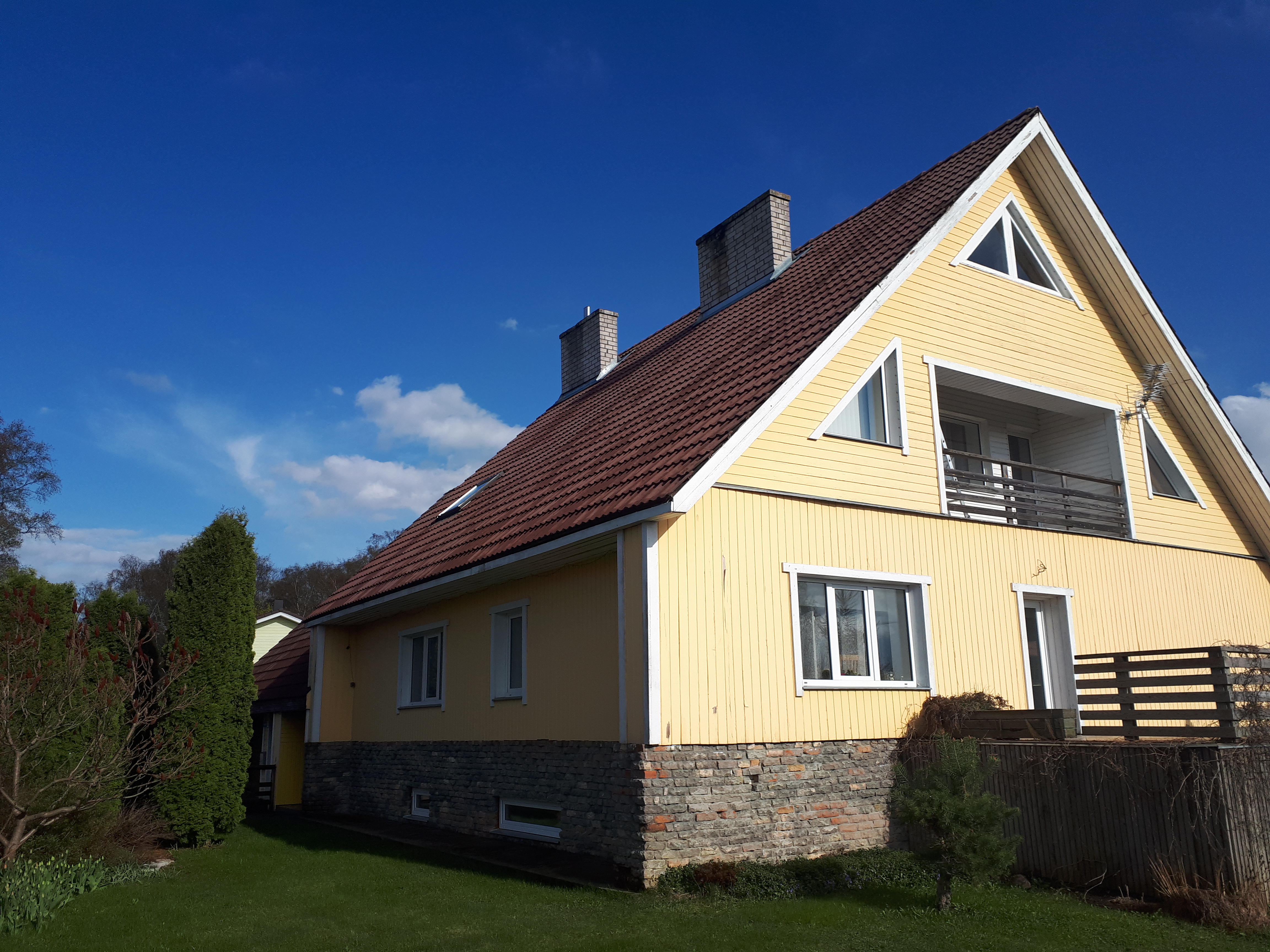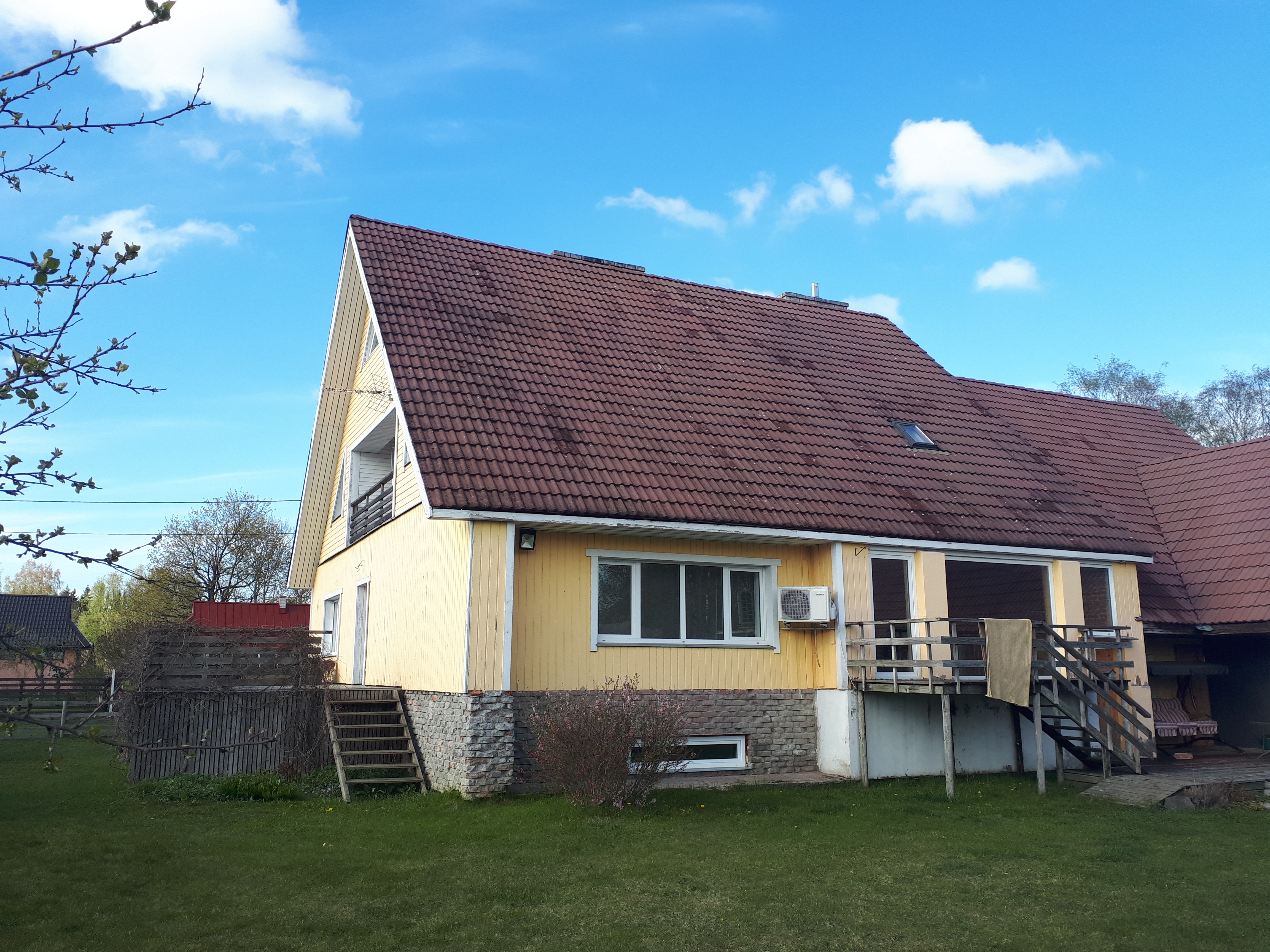 Maja katuse harja kõrgus ~10m, räästa kõrgus ~3m. kaks väikest katuseakent, kaks korstnat.
