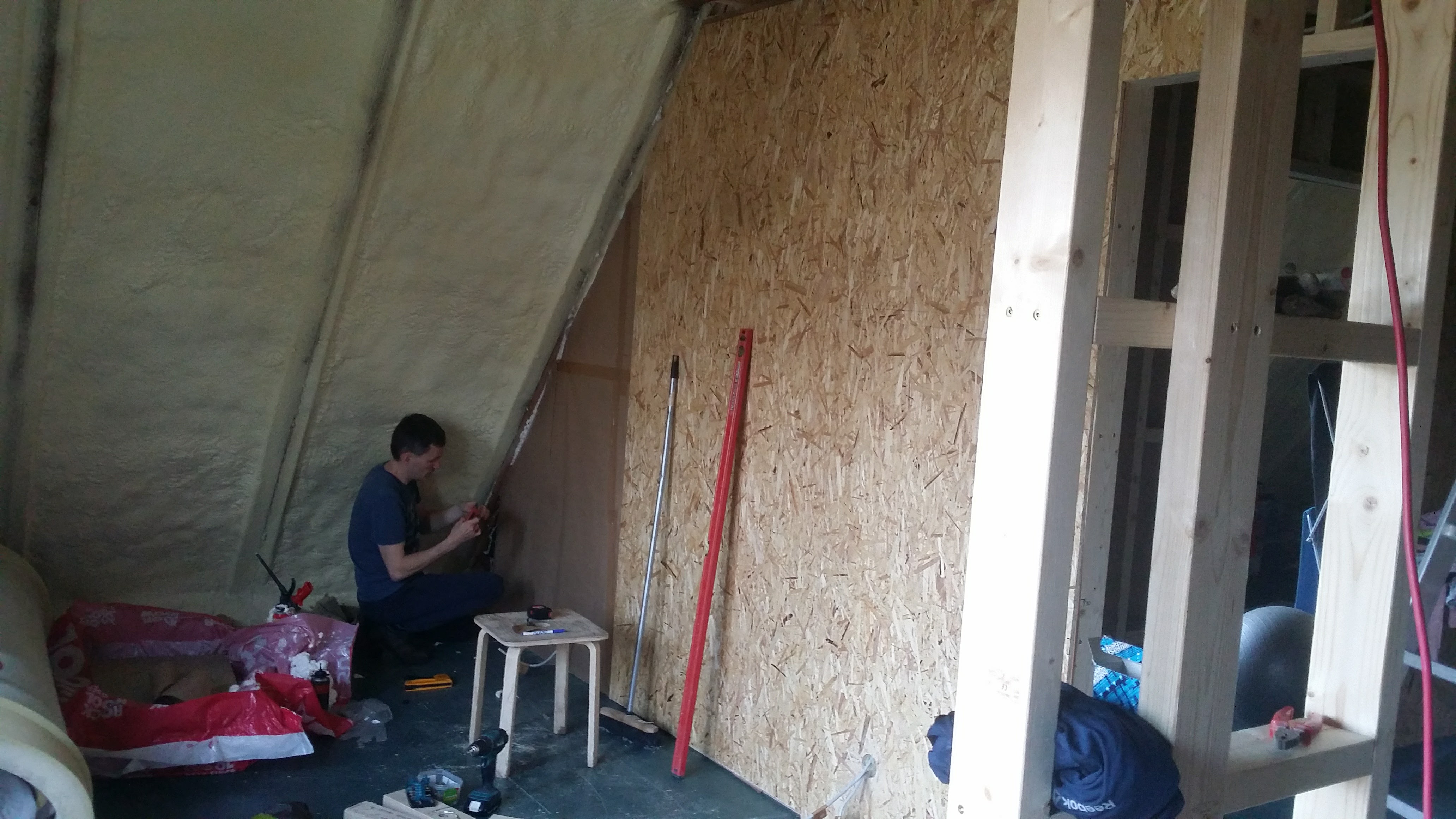 Laepind 12m2 + kaldkatuse pind 9m2 - soojutus on pur vahuga tehtud katusekonstruktsiooni vahele. Looma peaks puidust raamistiku, mis oleks loodis ja põrandaga ühtlane ning mille külge voodrilaud paigaldatakse. Seejärel paigaldama juba värvitud voodrilaua.
