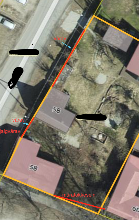 Puuaed: Üks autovärav, üks jalgvärav ja üks koht kus värav on võimalik lahti saada (koht haagissuvilale ja koht võib olla lihtne väräv või midagi muud). Pikkus 15,5 + 5,5 m. Kattelaud. Värv tume sinine.