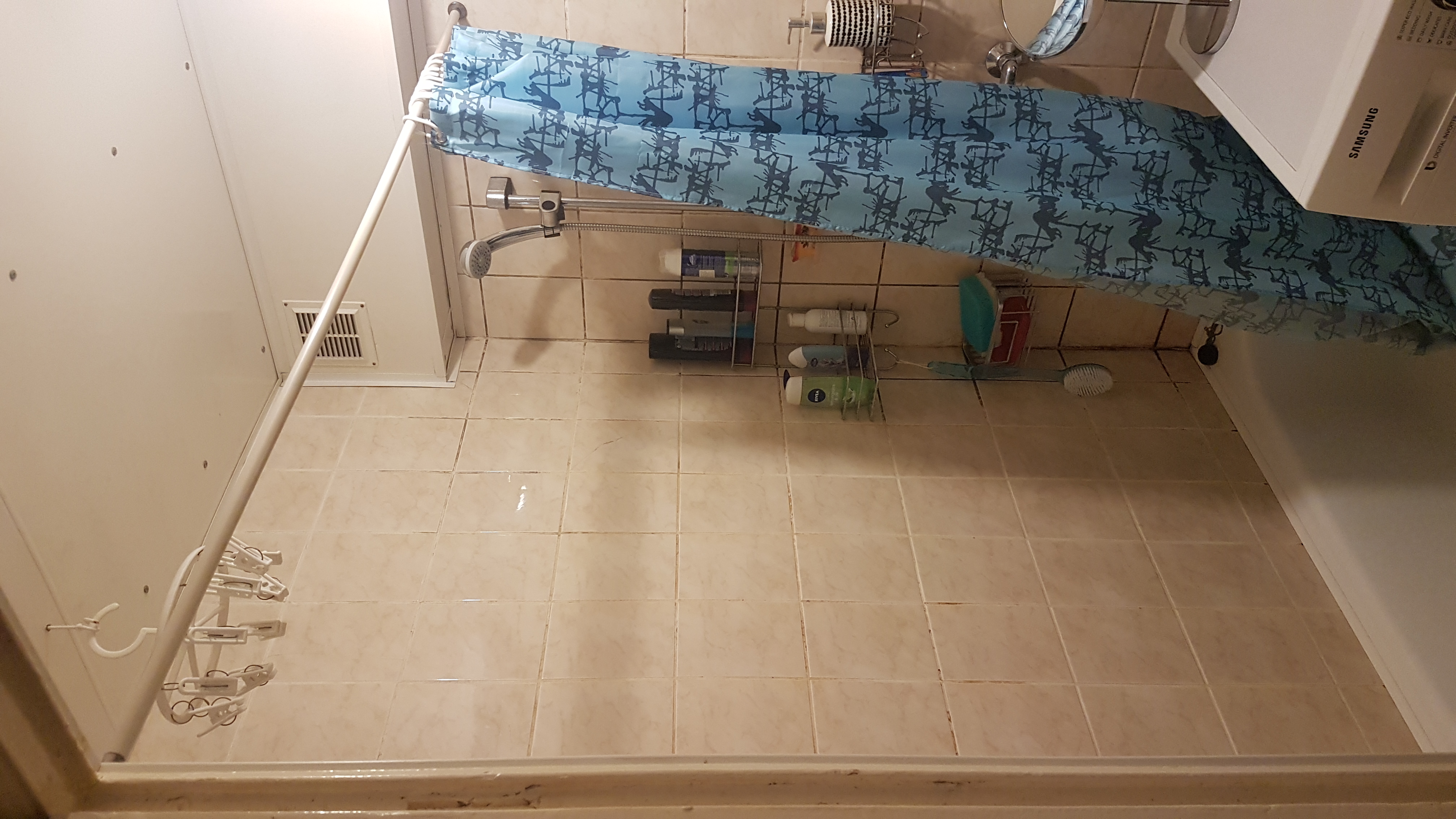Materjal Tellija poolt: seina- ja põrandaplaadid, uks+liistud, pistikupesad ja lüliti, süvisvalgustid, ventilaator, siugtoru, WC pott koos seinaraamiga, mööbel, kraanikauss, dušiklaas