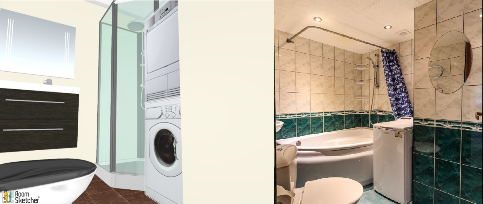 Dushinurk peaks olema sügavama aluse ja klaasseintega. Ei soovi valmis dushinurka, vaid et torud tuleksid ikka seinast. Lisan ka pildi, kus on näha vannituba enne ja pärast. Pärast pilt on illustratiivne näitamaks, kus mis peaks asuma (mõõtkava on silma järgi pildil). Peegli juurde on veetud ka juhtmed, et saaks panna kummagile poolele kaks valgustit. Samuti pesumasin/kuivati taga on pistikud olemas.