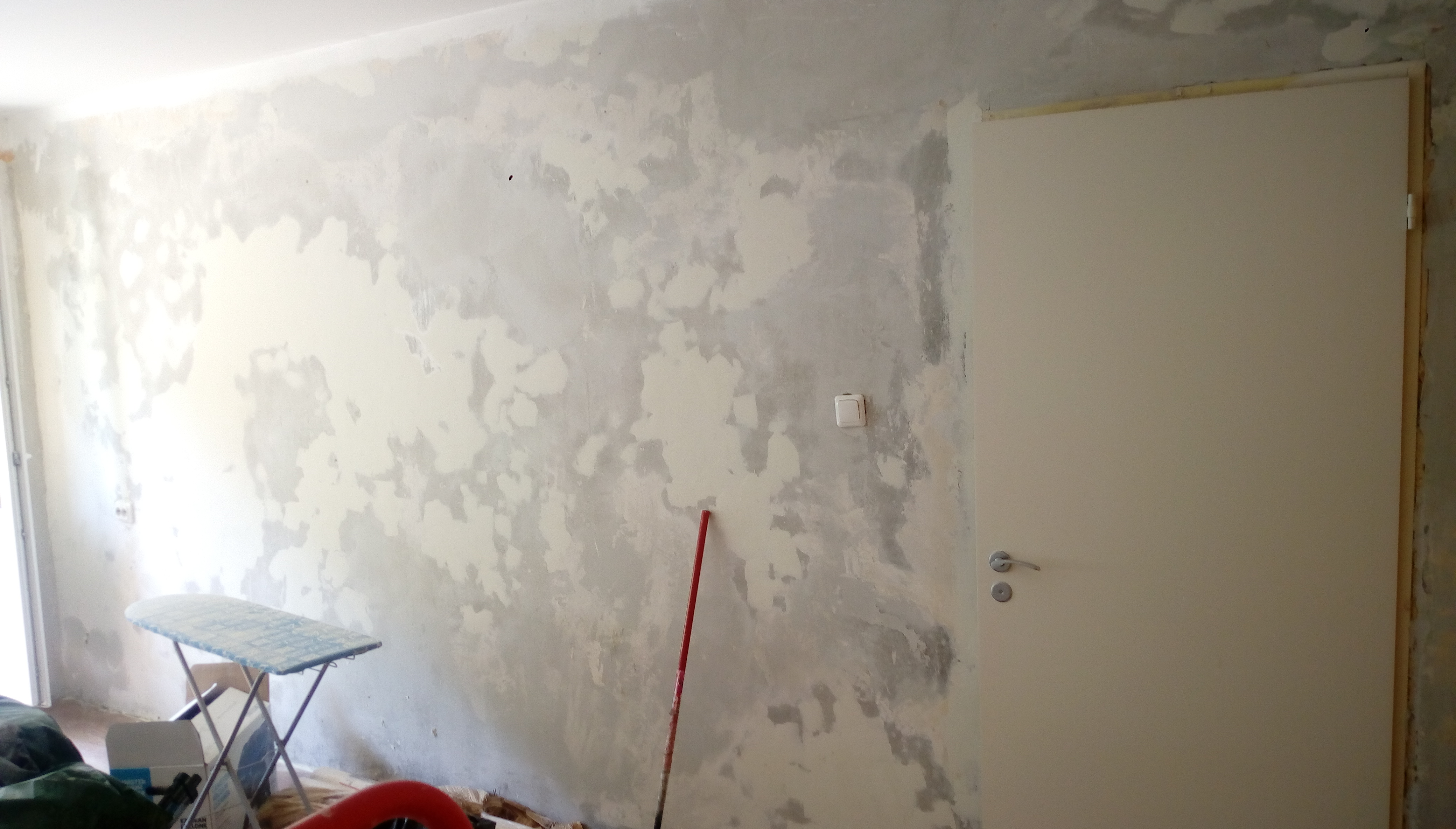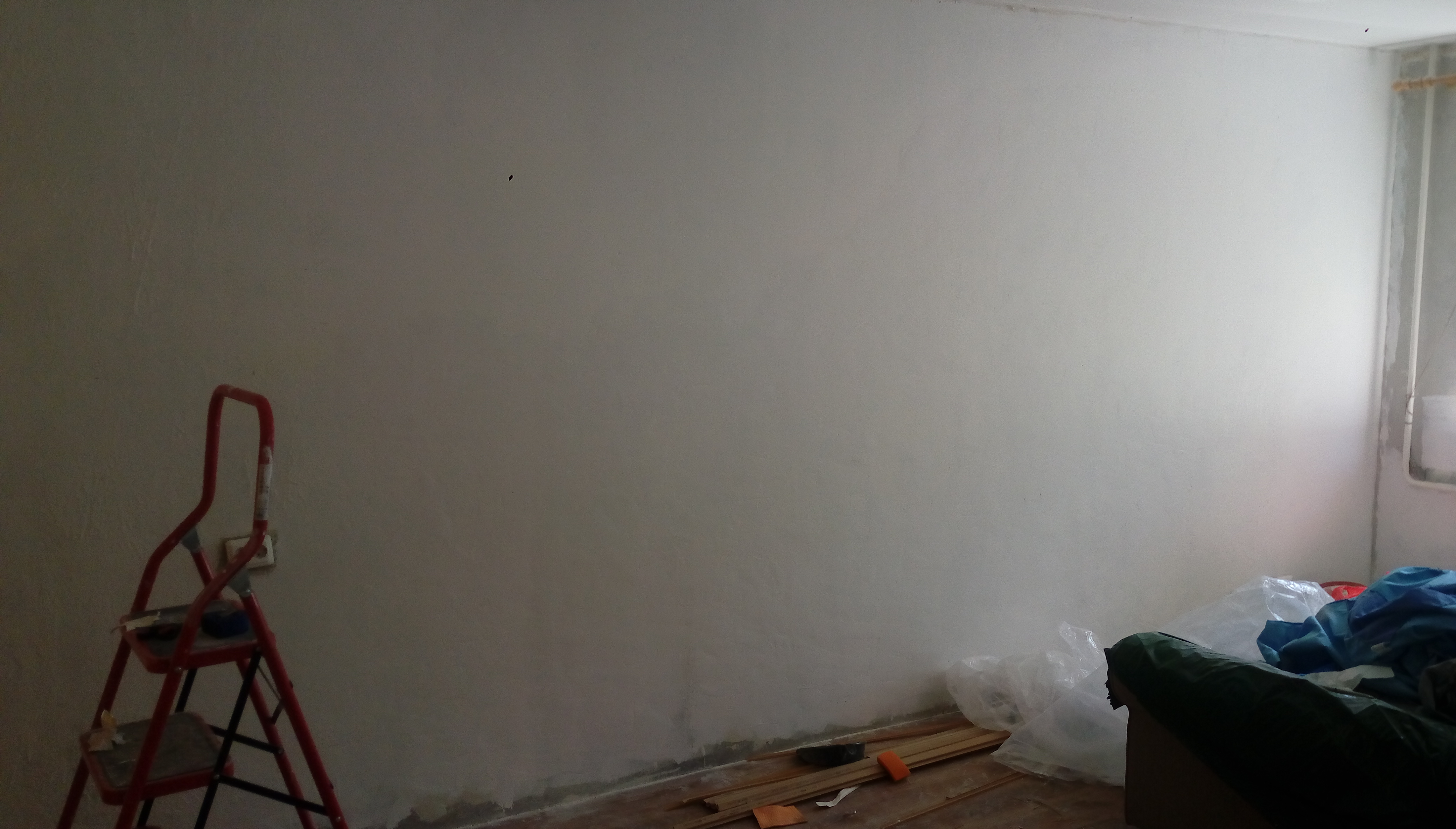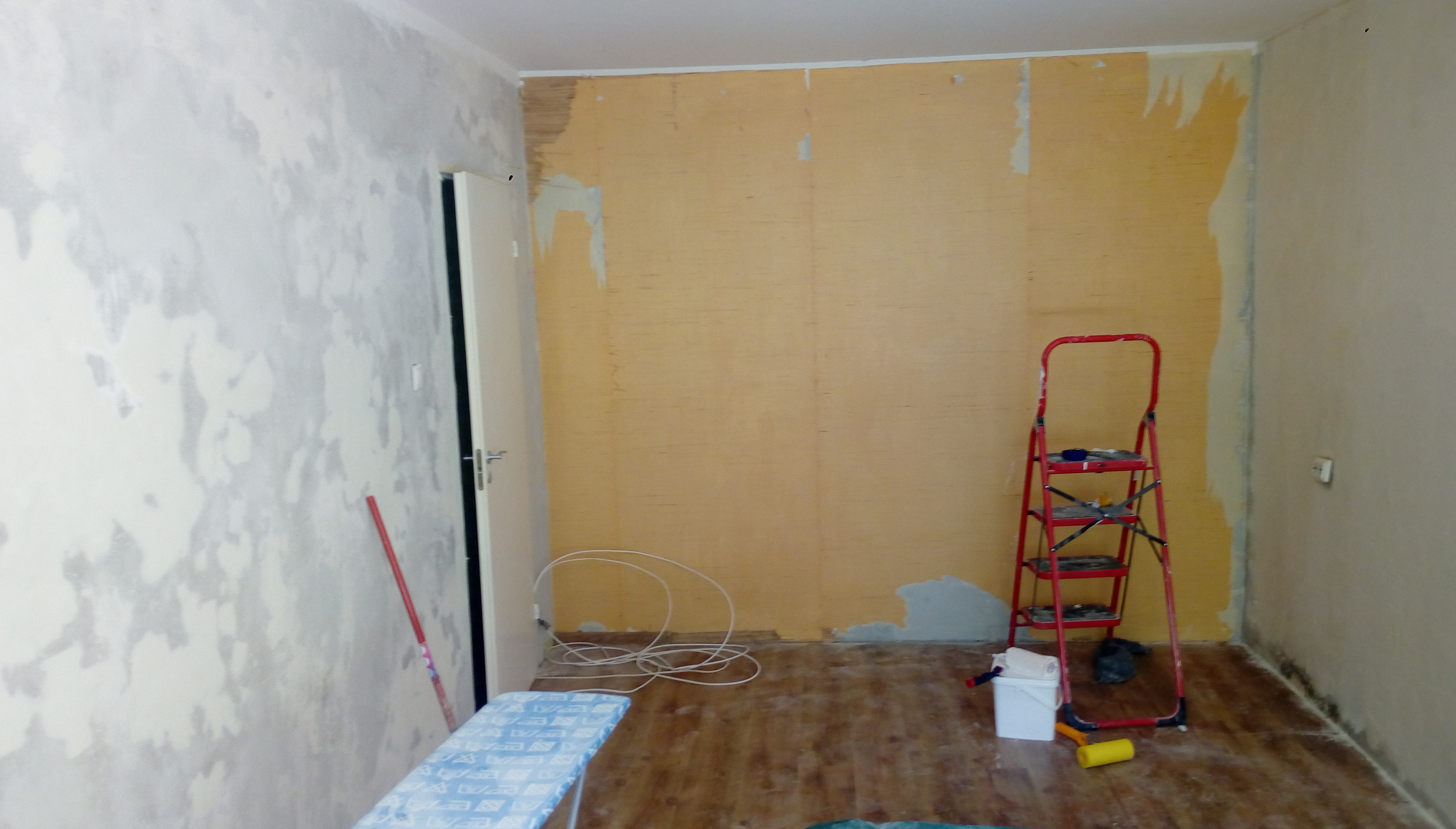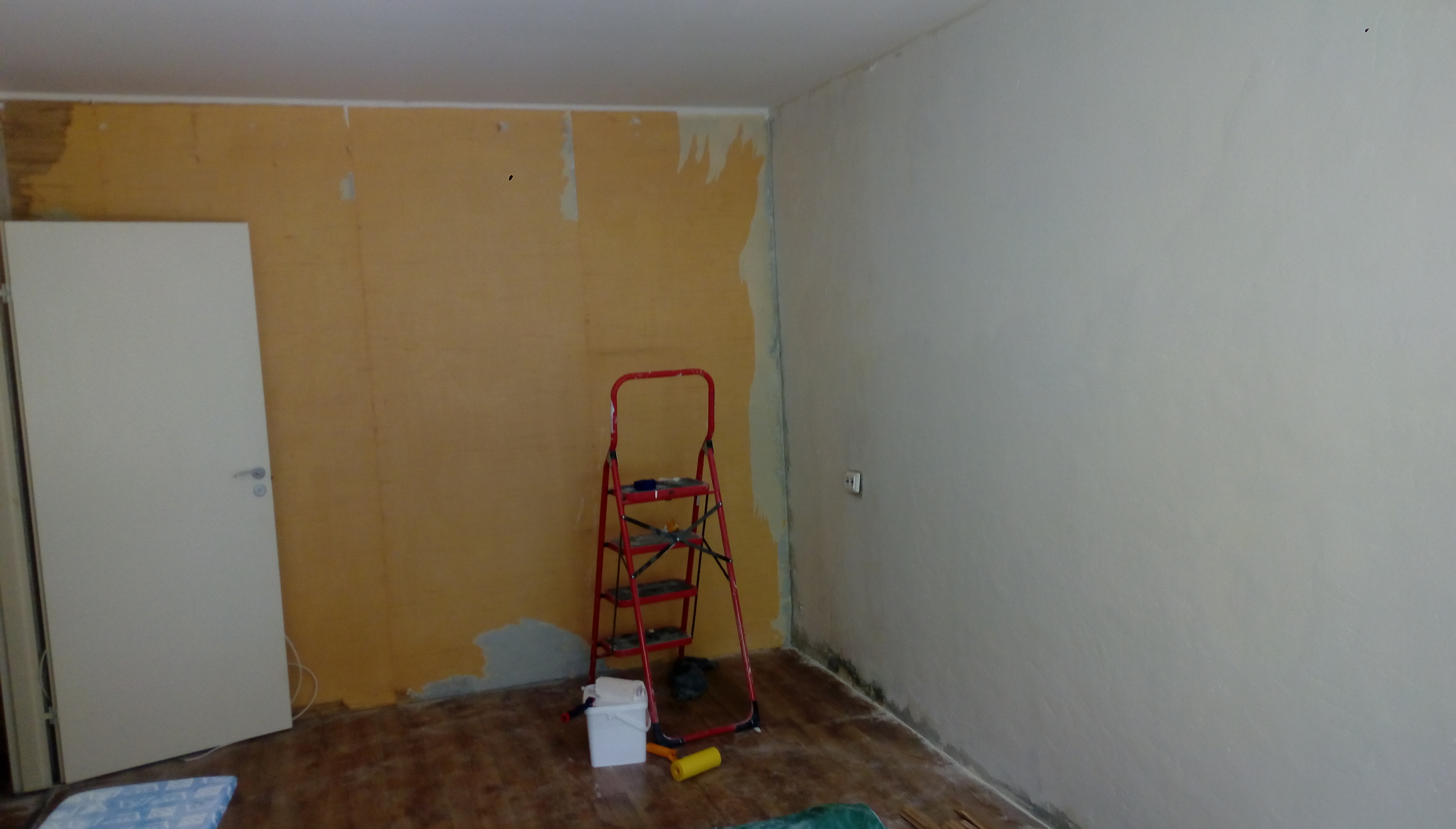 Umbes 5 paani tapeedi panek, aluspind vajab osaliselt ettevalmistamist - osaliselt on seinad pahteltatud ja lihvitud. Kohal, kuhu tapeet läheb, asub 1 lüliti, 2 pistikut ning ukse koht. Põrandaliistud on maha kruvitud ja neid pole vaja tagasi panna.