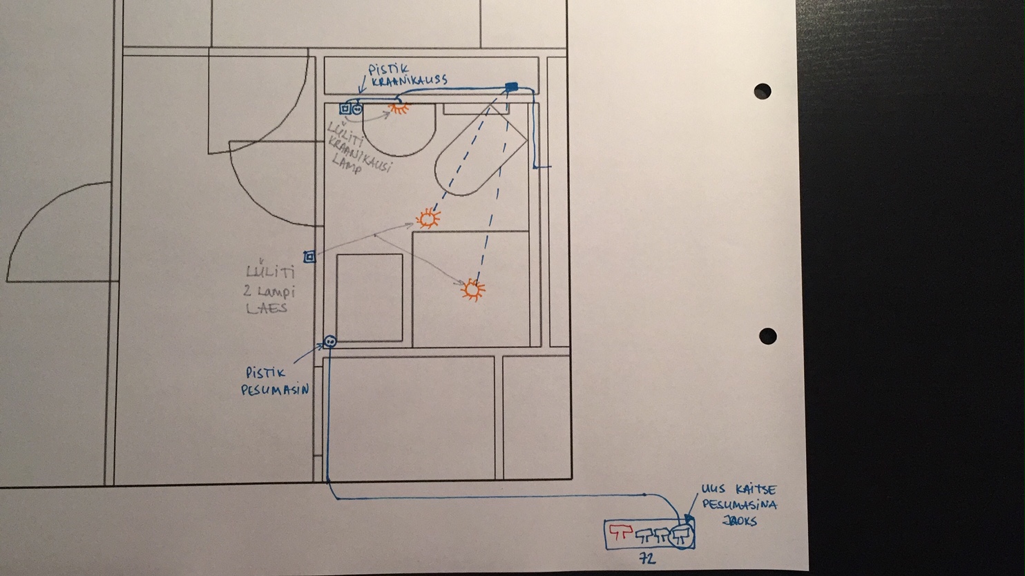 - Elekter: uued pistikud, ühestest pistikutest teha kahesed (hetkel kokku 3 pistikut, s.t. tulemus 6 pistikut) ja lülitid