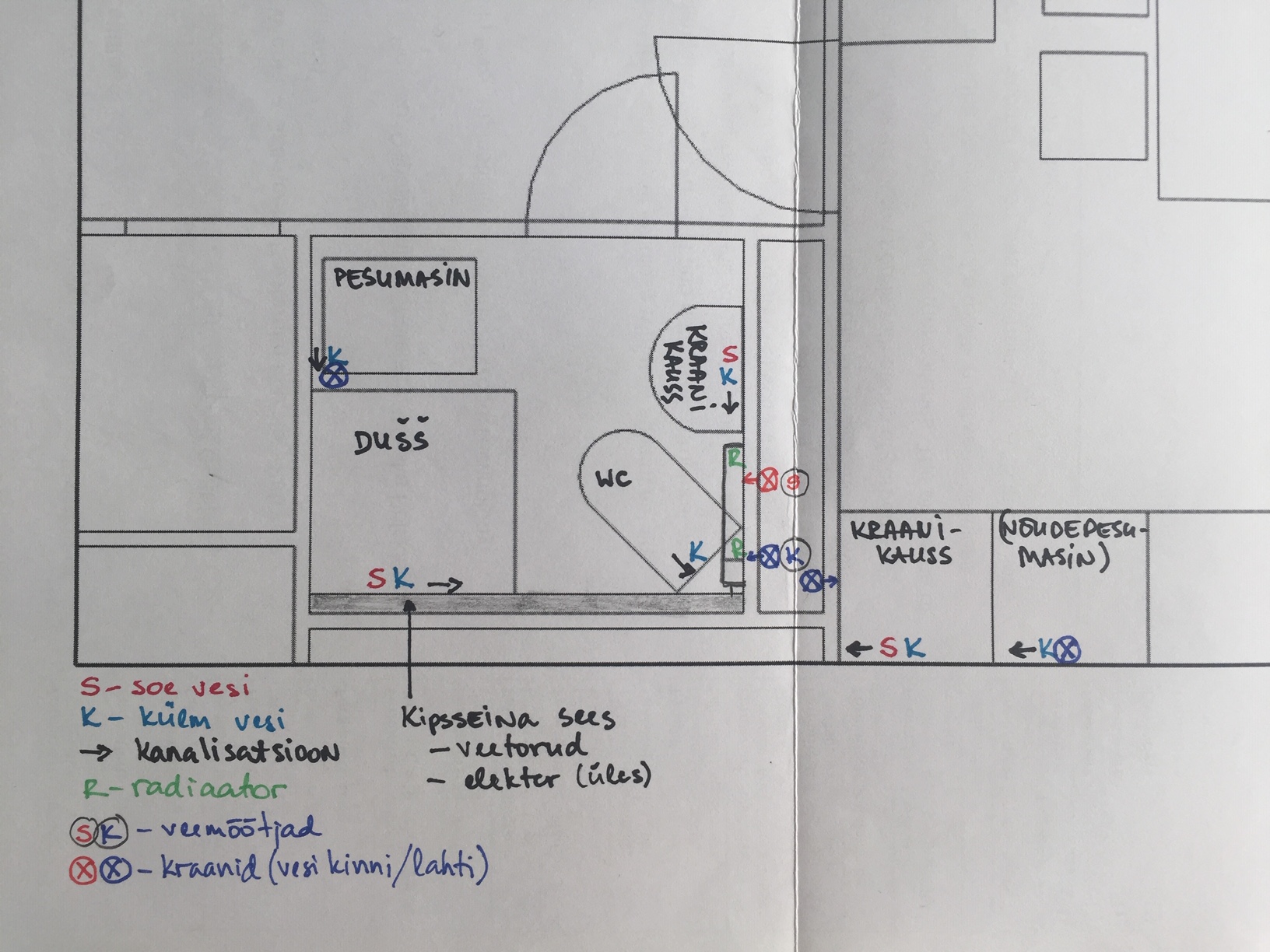 - Torud: uued torud alates korteri püstikust, vesi ja äravool dushinurga ja pesumasina jaoks, s.h. eraldi suletav kraan pesumasina jaoks. Torud panna kas madalalt kipsist seina taha või mingi muu mõistlik lahendus, et need liiga näha ei jääks.