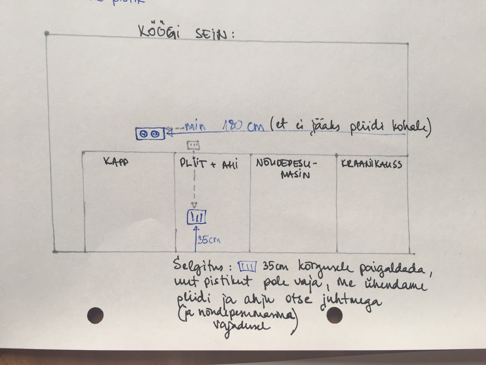 - Elekter: uued pistikud ja lülitid, pliidi pistik seina sees alla poole u 30 cm kõrgusele põrandast, et saaks pliidi ja ahju otse ühendada