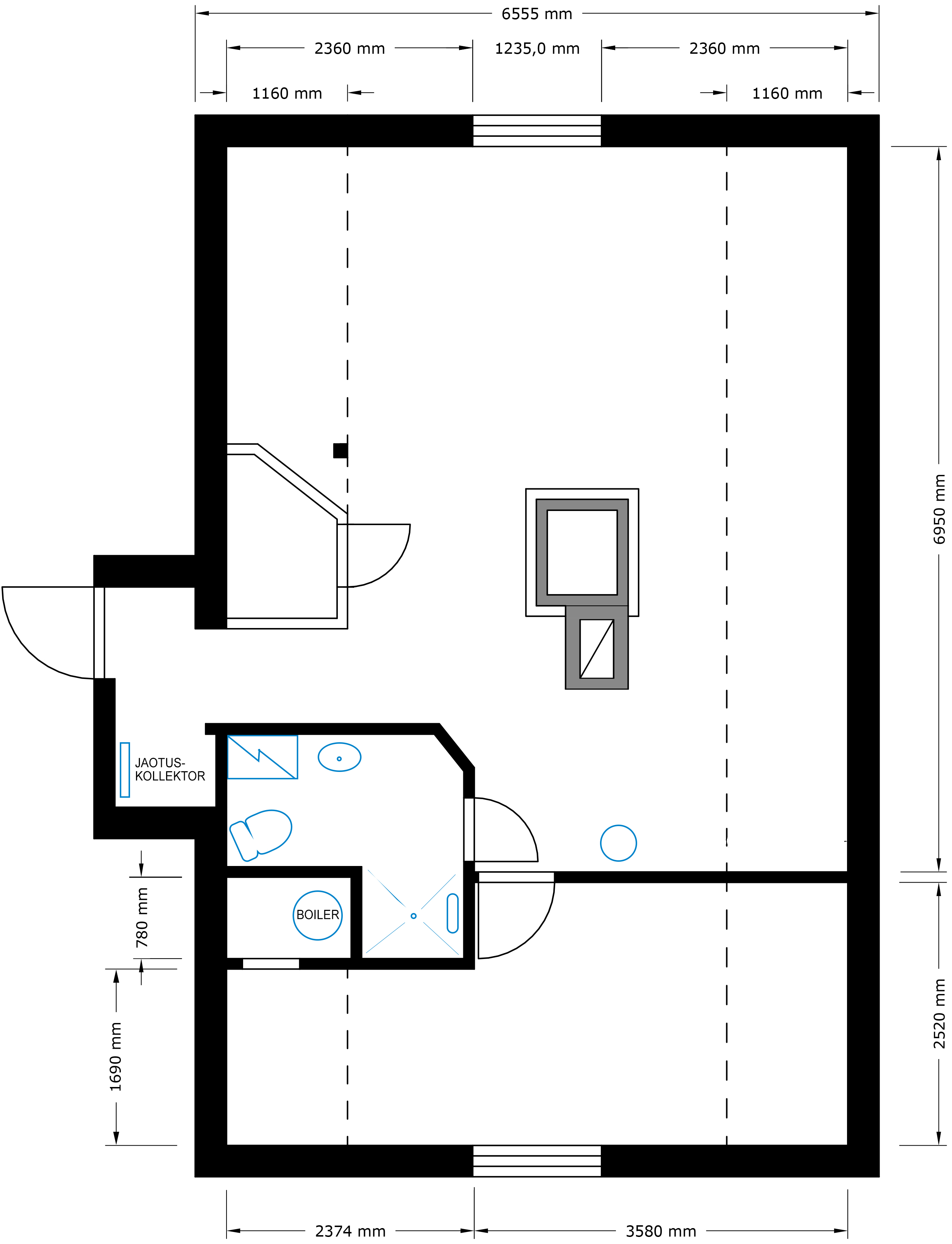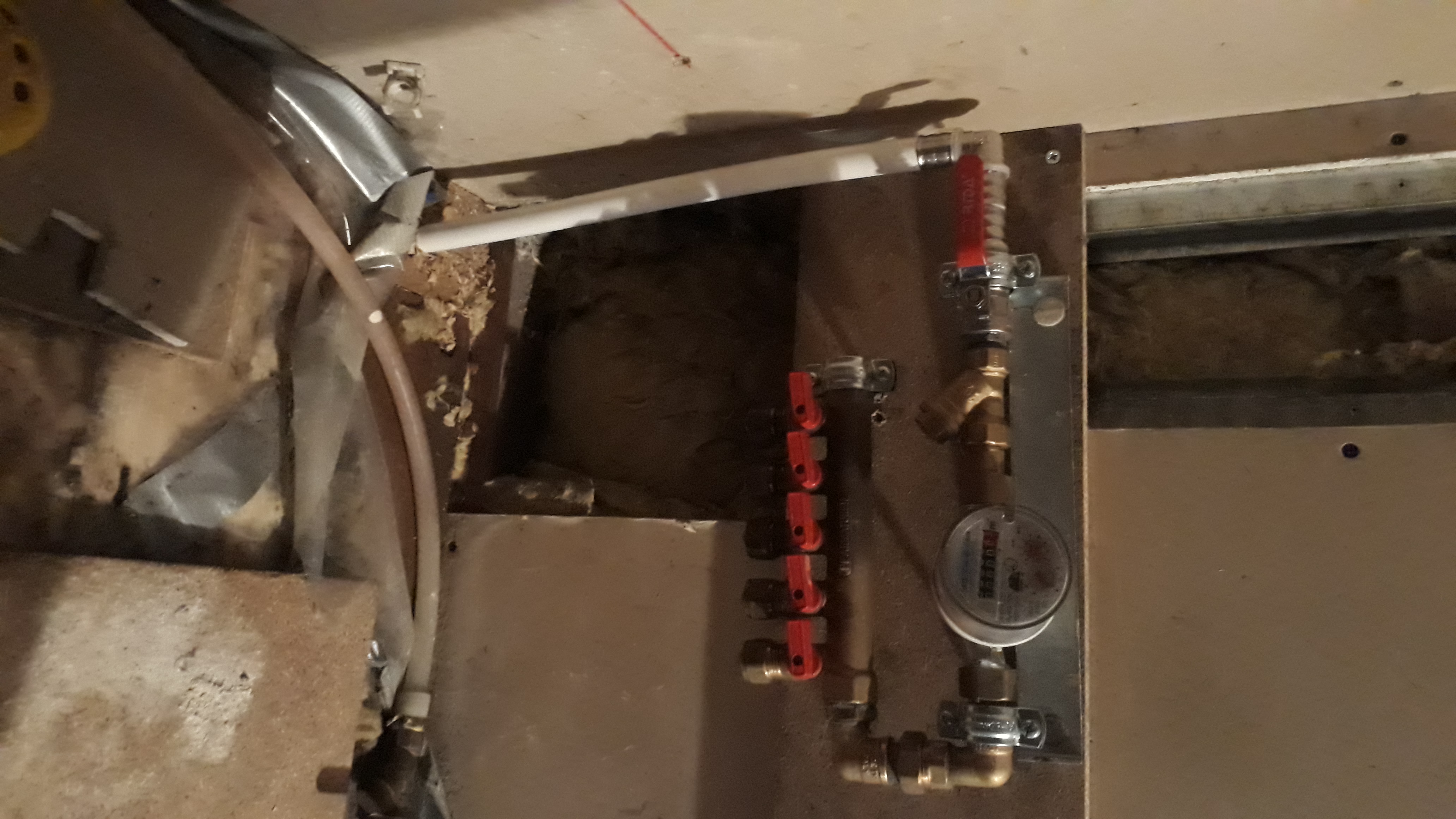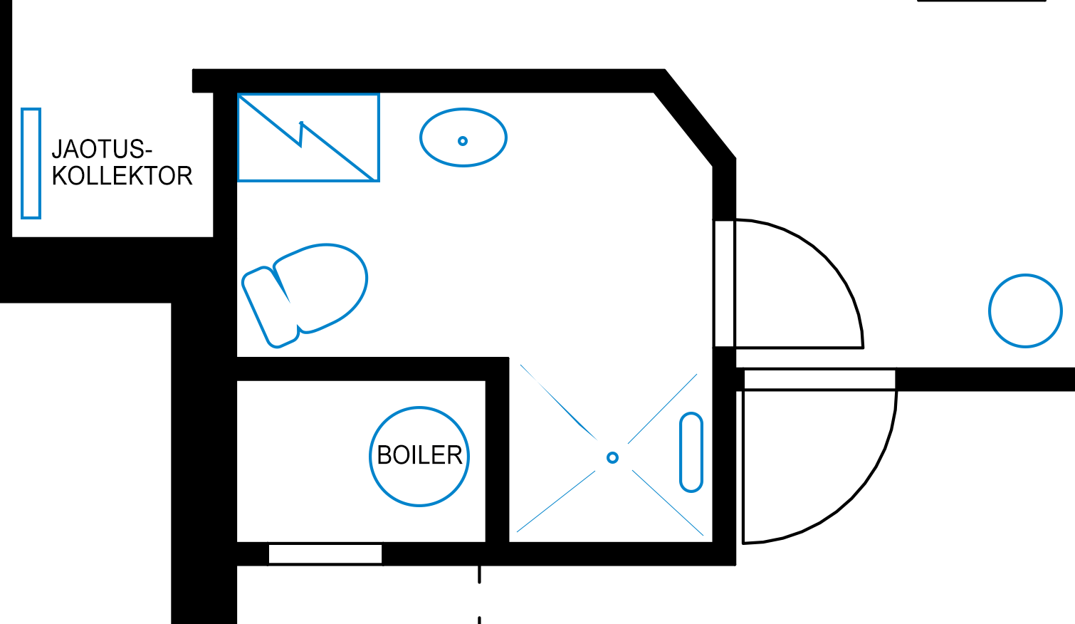 Korteris vaja vedada uued veetorud. Esikus jaotuskollektor, sellest ühendused WC-poti ning pesumasinaga ning boileriga, sellest edasi dušisegistiga, kraanikausiga vannitoas ning valamuga köögis. Seda on ilmselt kõige lihtsam teha ilmselt seinte seest ja lae alt (karkassil kipsplaat). Lisatud ka plaan, kus näha veemõõdusõlm/jaotuskollektor, boileri ja ühenduste asukohad.