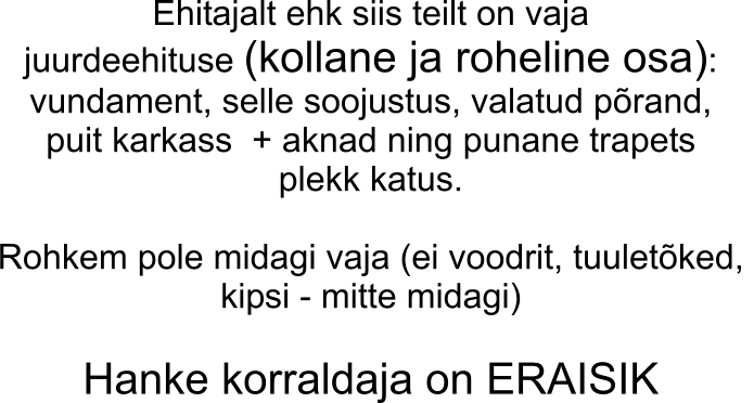 Vaja hinnapakkumist. Ehitaja peab ehitama fibost vundamendi, puit karkass + aknad ning katus (trapets, ei ühtegi akent ega luuki).