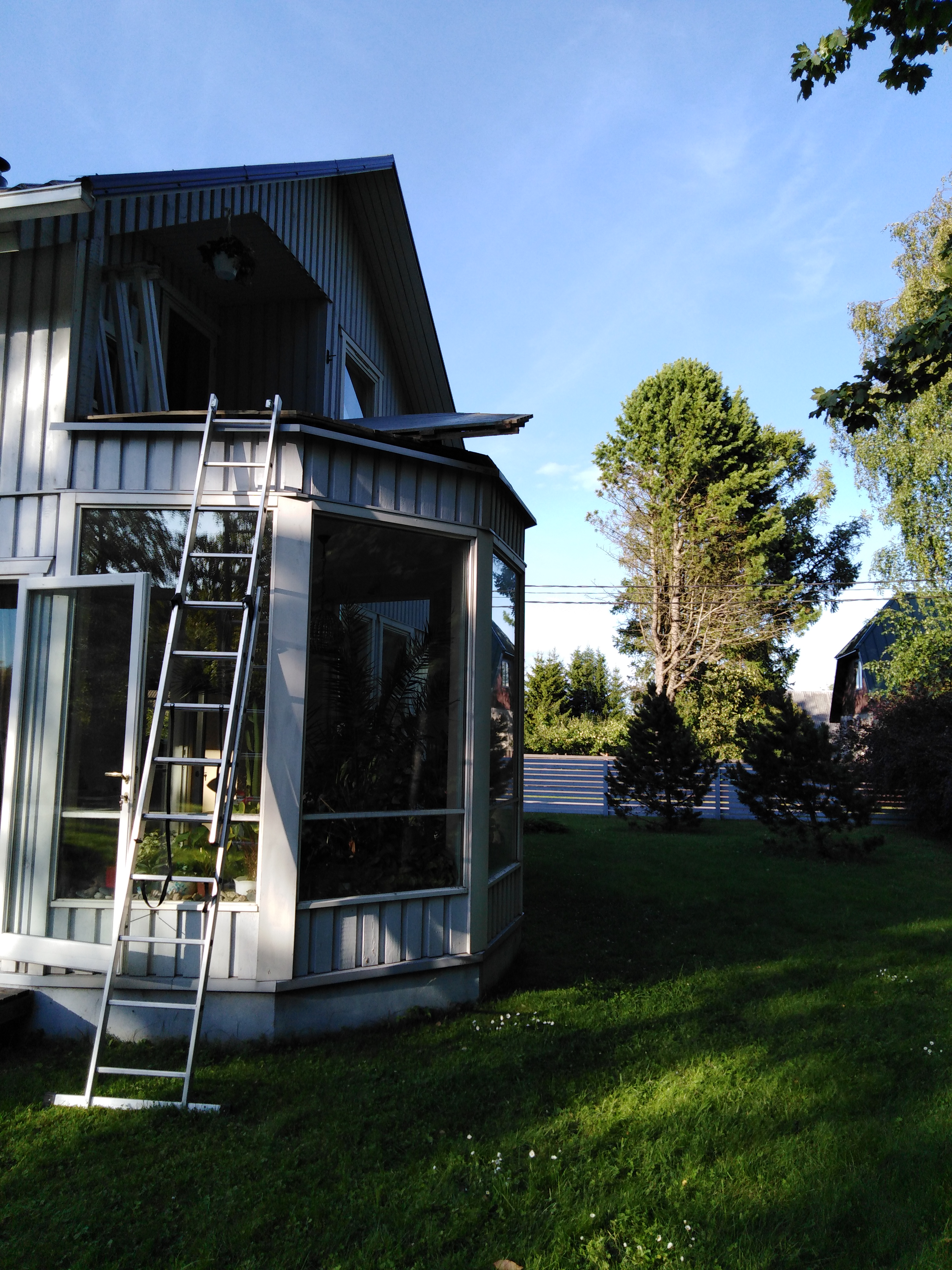 Väikese kaldega veranda lagi on aeg-ajalt lekkinud, sissevool on toimunud kohatise vale kallaku tõttu. Katus on 15 aastat vana, üldpind on 10 m2, ilmne kahjustus esineb umbes 1 m2 suurusel alal, kus lagi astudes on pehme. Aeglane niiskuse sisseimbumine on ilmselt mädandanud 1 m2 suuruse ala. Vajalik on sissevoolukoha tuvastamine ja kahjustatud osa remont.