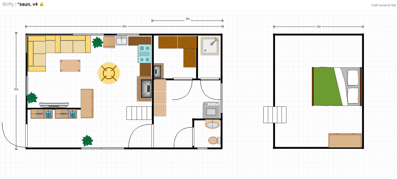 3) Majal on saunaruumide kohal teine korrus, kus saab magada (midagi peale voodi sinna ära mahtuma ei pea, võib olla nö ärklikorrus, madal). Eluruumi kohal lage ei ole, selle asemel kohe soojustatud katusealune. Maja kogukõrgus ei tohiks ületada 5m.