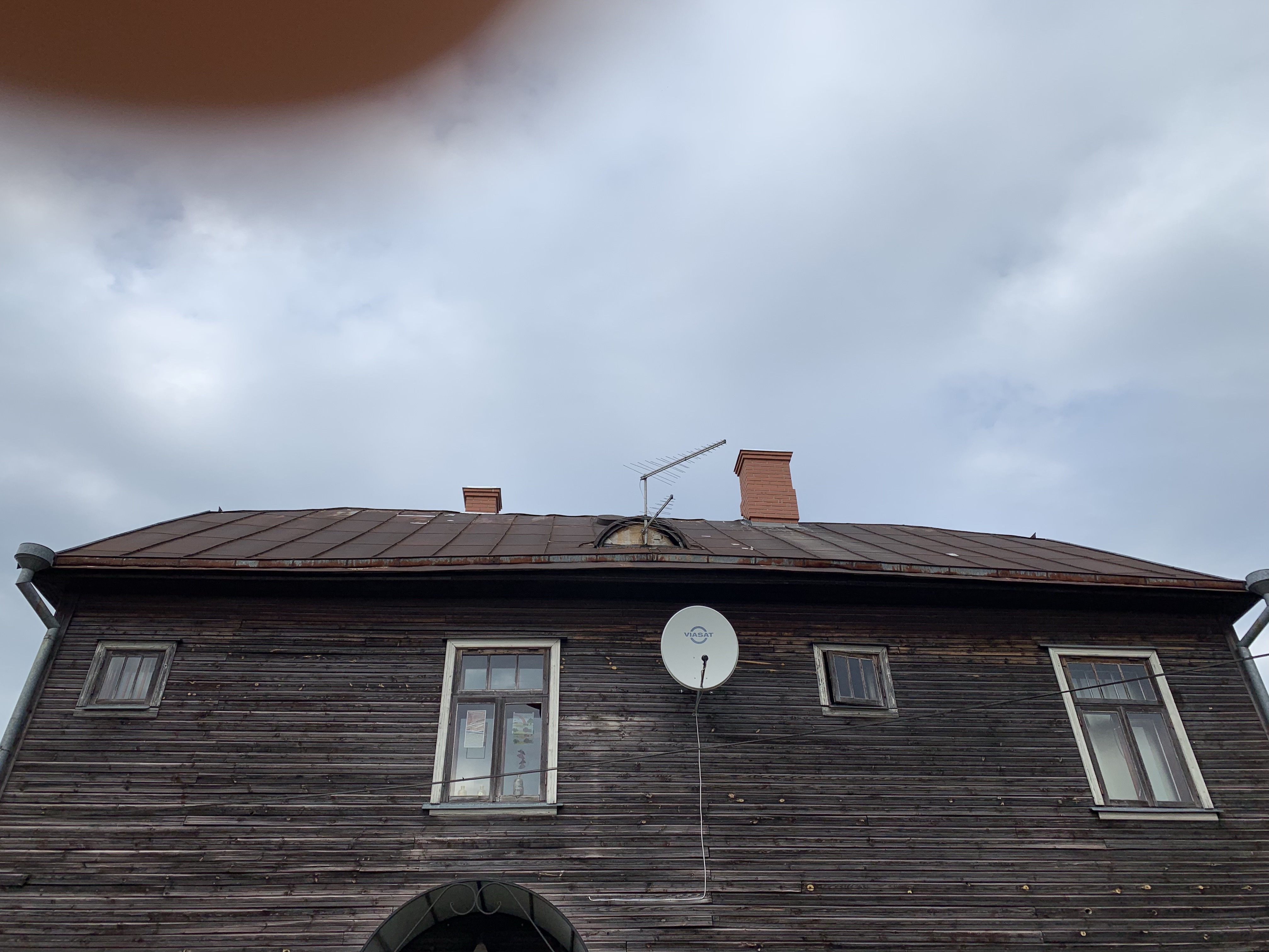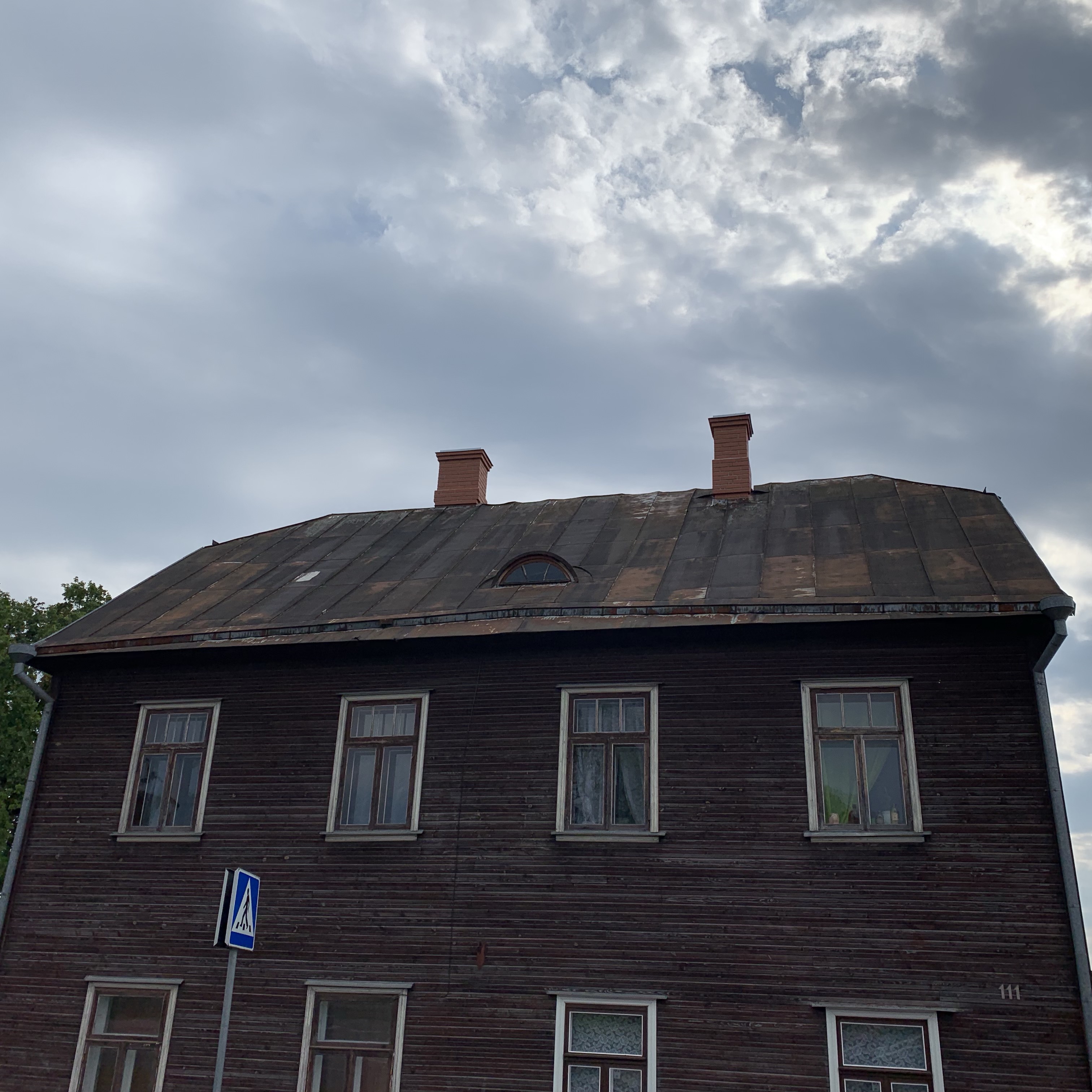 Väikese kolme korteriga ühistu palkmaja plekkkatuse vahetus Tartus . Valtsplekkkatus+materjal+mõõdistus. Katusel on üks väike kaarjas aken mõlemal pool.