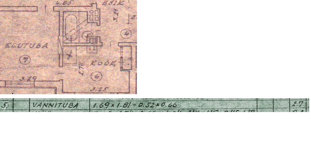 Vannitoa ühes seinas soojamüüri serv ca 41 cm, sealt jookseb u 2,1 m kõrguselt diagonaalselt üle teise seina lõõr, mis lõpeb korstnajalaga (pilti vt2)