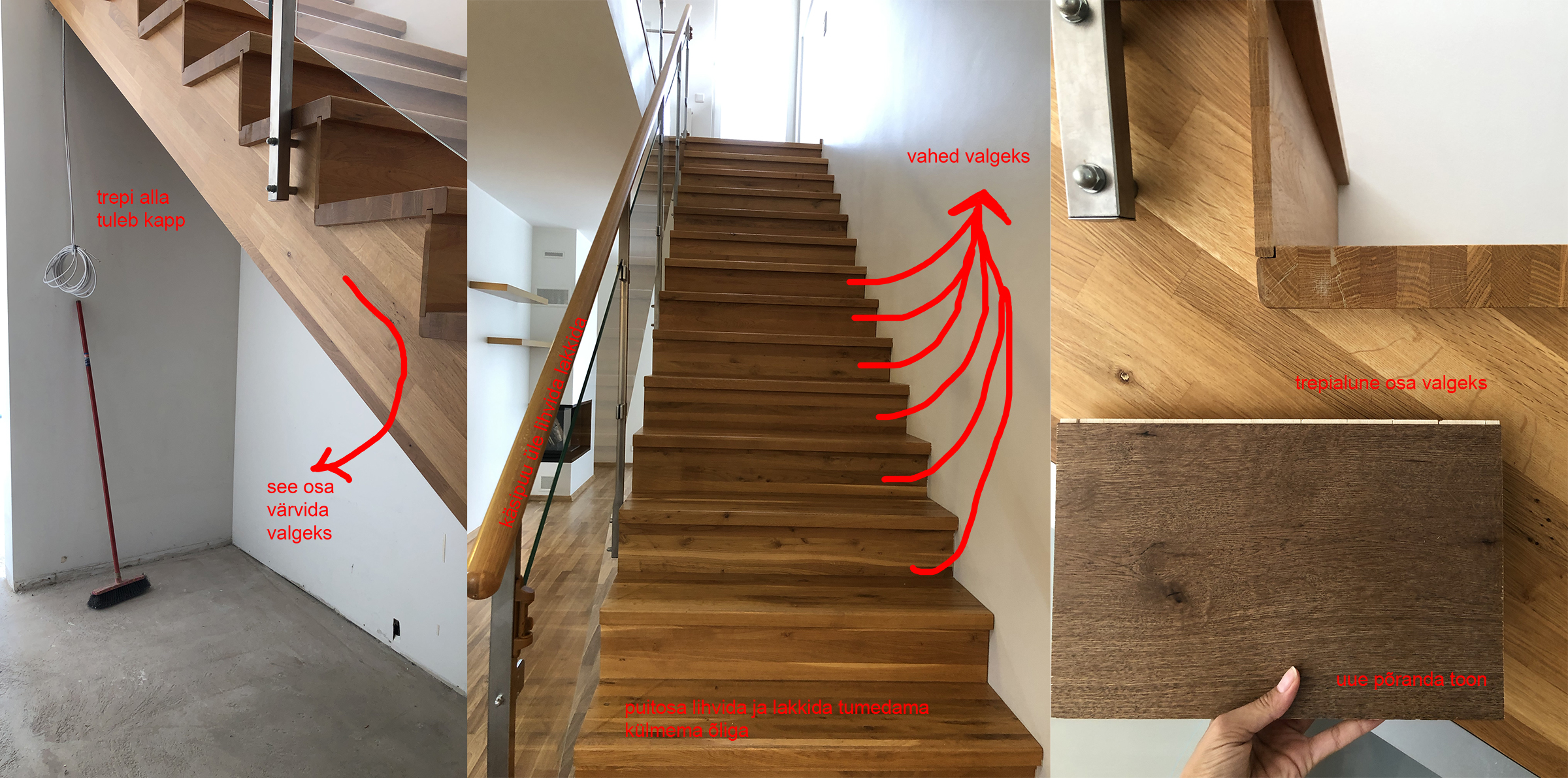 Soovin renoveerida puidust treppi, et see sobituks paremini põranda ja värske remondiga. Trepi astmed, käsipuud lihvida ja katta tumedama õliga (ära kaotada kollakas toon ja muuta tumedamaks, sest parkett tuleb külmema tooniga tume), trepi vahed värvida valgeks ja välisosa ka valgeks. Trepp on üldiselt heas seisukorras, ca 10a vana.