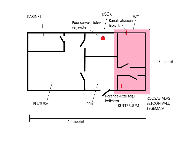 Vaja teha: Vesi laiali viia. Köögist wc-sse ja kütteruumi, luua äravoolud köögist wc-sse ja sealt välja. Köögist tuleb äravool wcsse põranda pealt, läbi seina wcsse, kus omakorda kogu üritus läheb betooni. Paigaldada kõiksugu väljavõtted: dušši, pesumasina, kraanide, küttekolde jms jaoks.