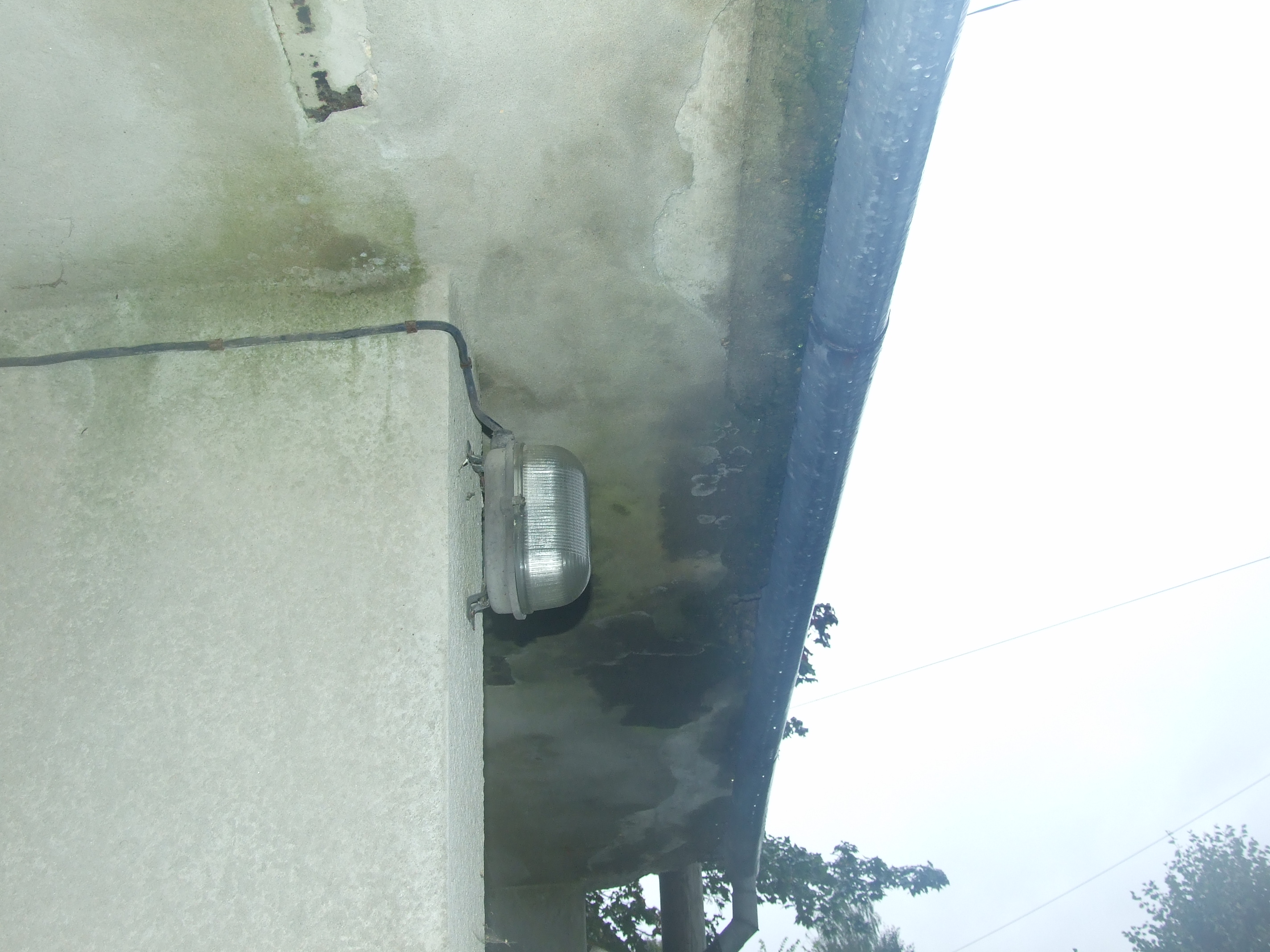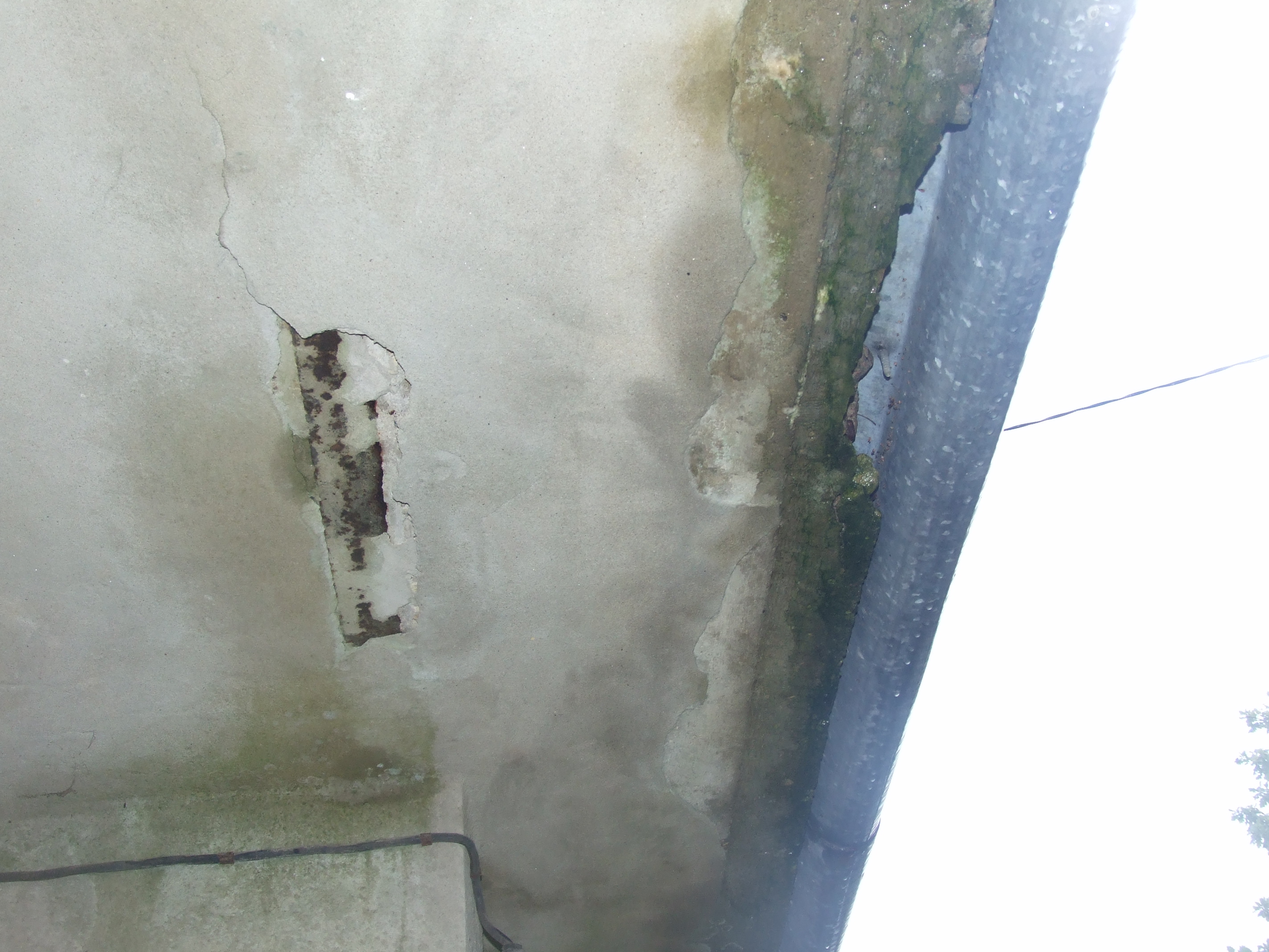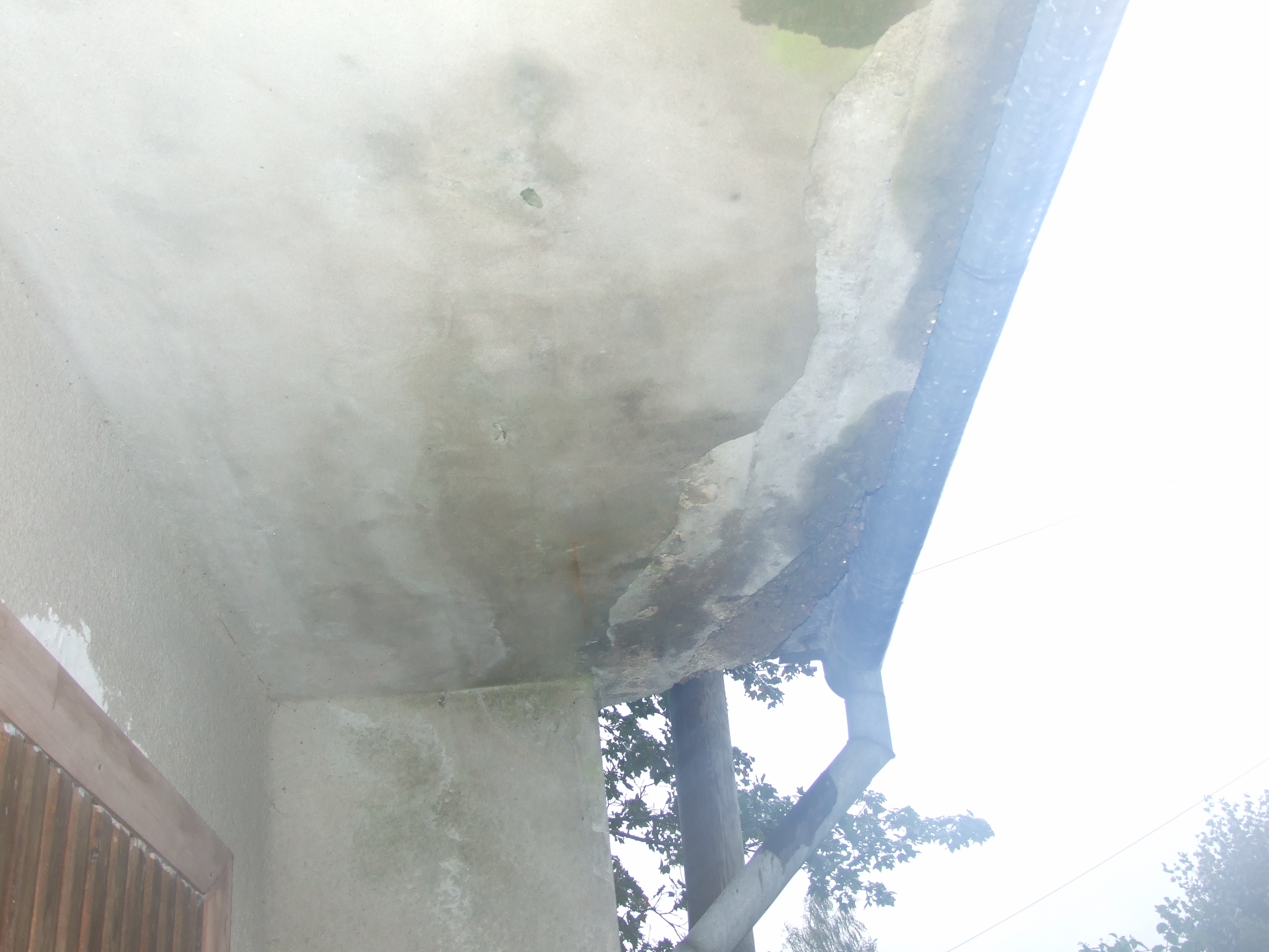 Varinguoht! Käesoleval ajal on bituumenikiht lagunenud ning betoon ning selle alumine viimistluskiht hakanud pudenema. Nurkmine osa karniisist on täielikult eemaldunud. Vihmaveerenn ripub kohati õhus ning selle kalle ei ole funktsionaalne.