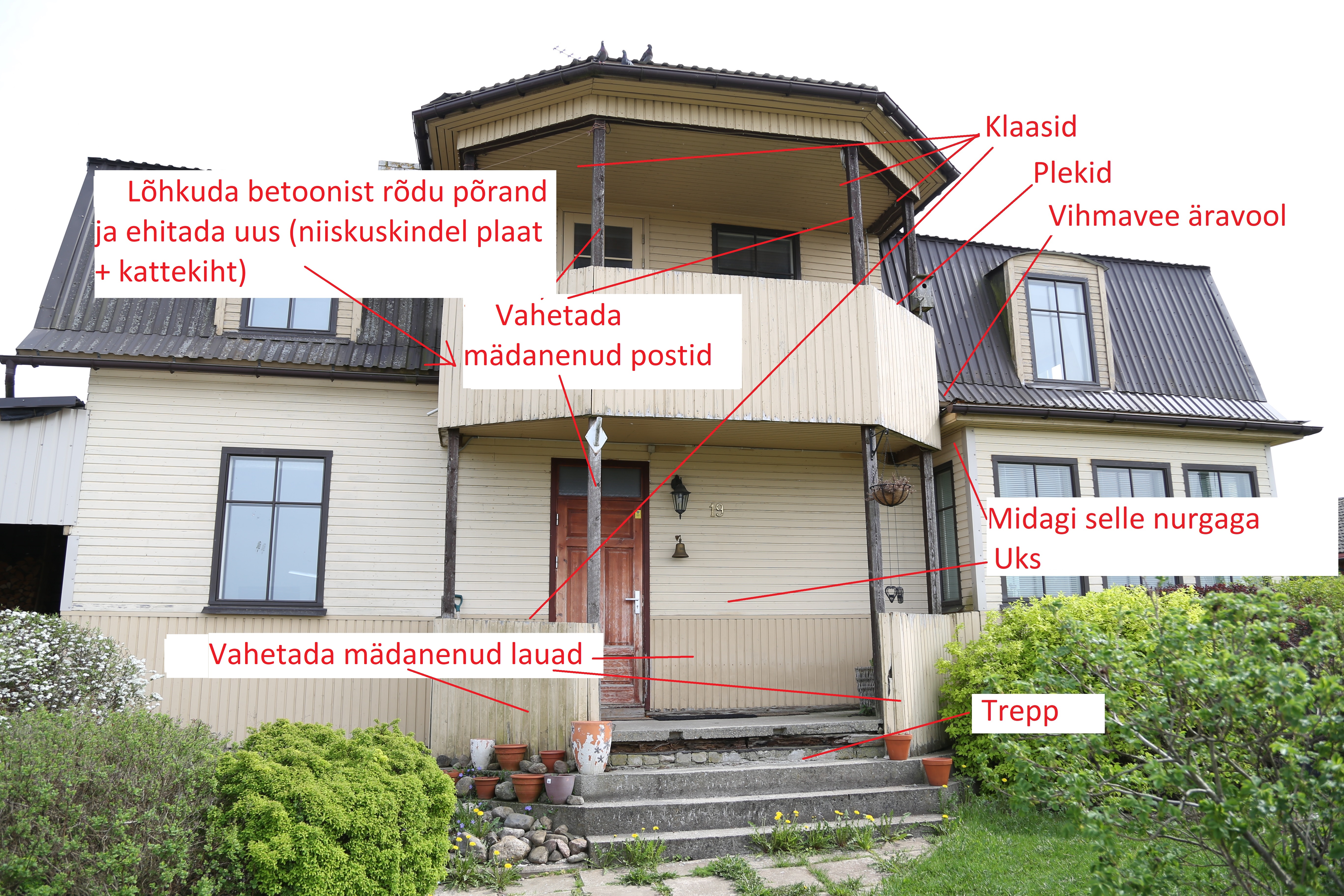 Soovitavad tegevused: 1. Rõdu betoonist põranda lammutus ja jäätmete äravedu. 2. Rõdule uue põranda ehitamine: mädanenud laudade ja prusside asendamine; niiskuskindlast plaadist põranda ehitus, millele paigaldada niiskuskindel põrandakattematerjal. 3. Mädanenud tugipostide asendus. 4. Rõdu ja ukse ümbruse mädanenud laudade asendus. 5. Trepi ja ukse-esise põranda lammutus ja jäätmete äravedu. 6. Uue betoontrepi ja ukse-esise põranda valamine. 7. Rõdu kinni ehitamine kergete avanevate klaaside paigutamisega. 8. Trepikoja kinniehitamine klaaspakettide ja aknaaluste plekkide lisamisega (soojustust ei ole vaja). 9. Vihmavee äravoolu korrastamine ja kohandamine ümberehitusega.