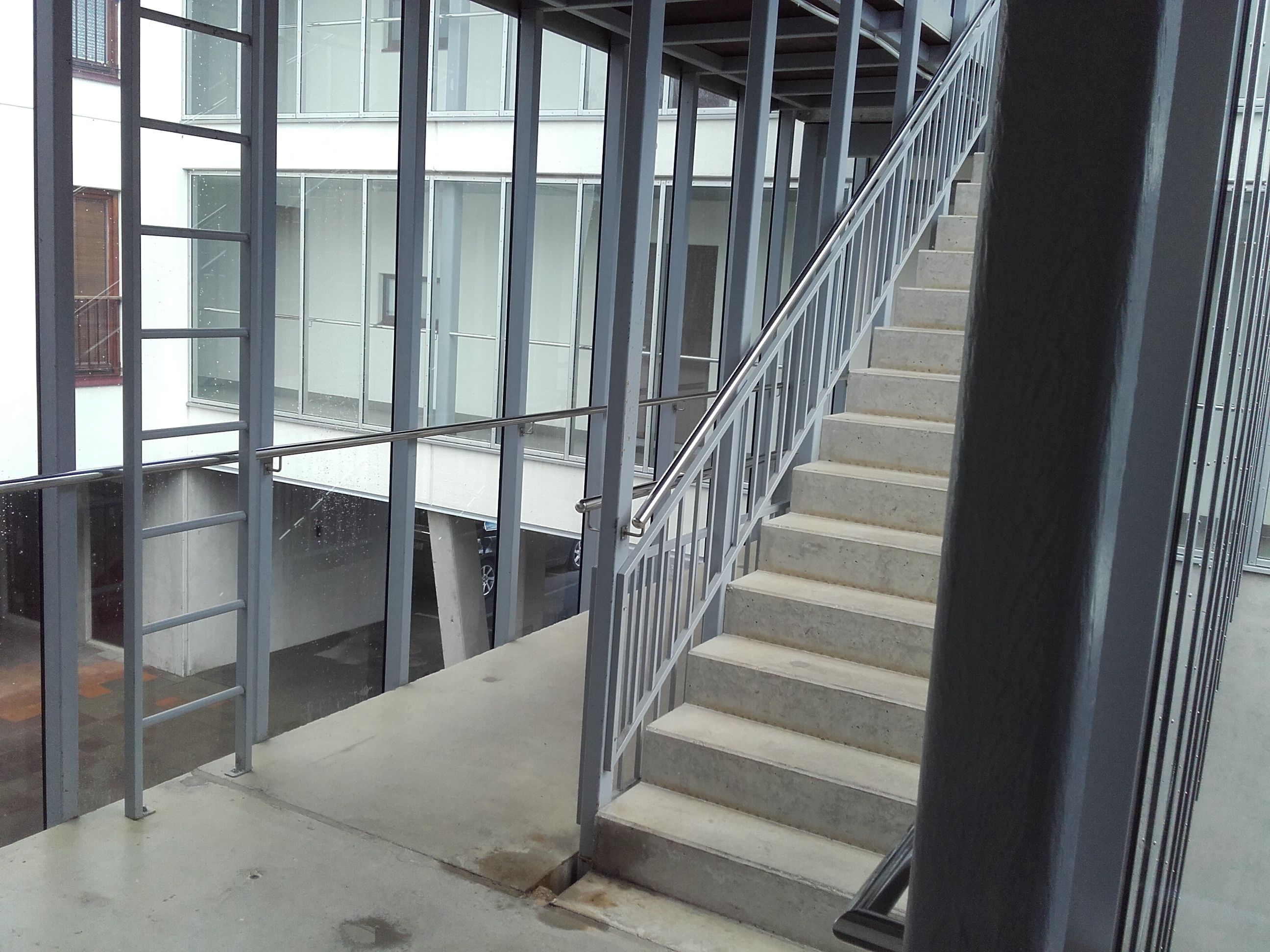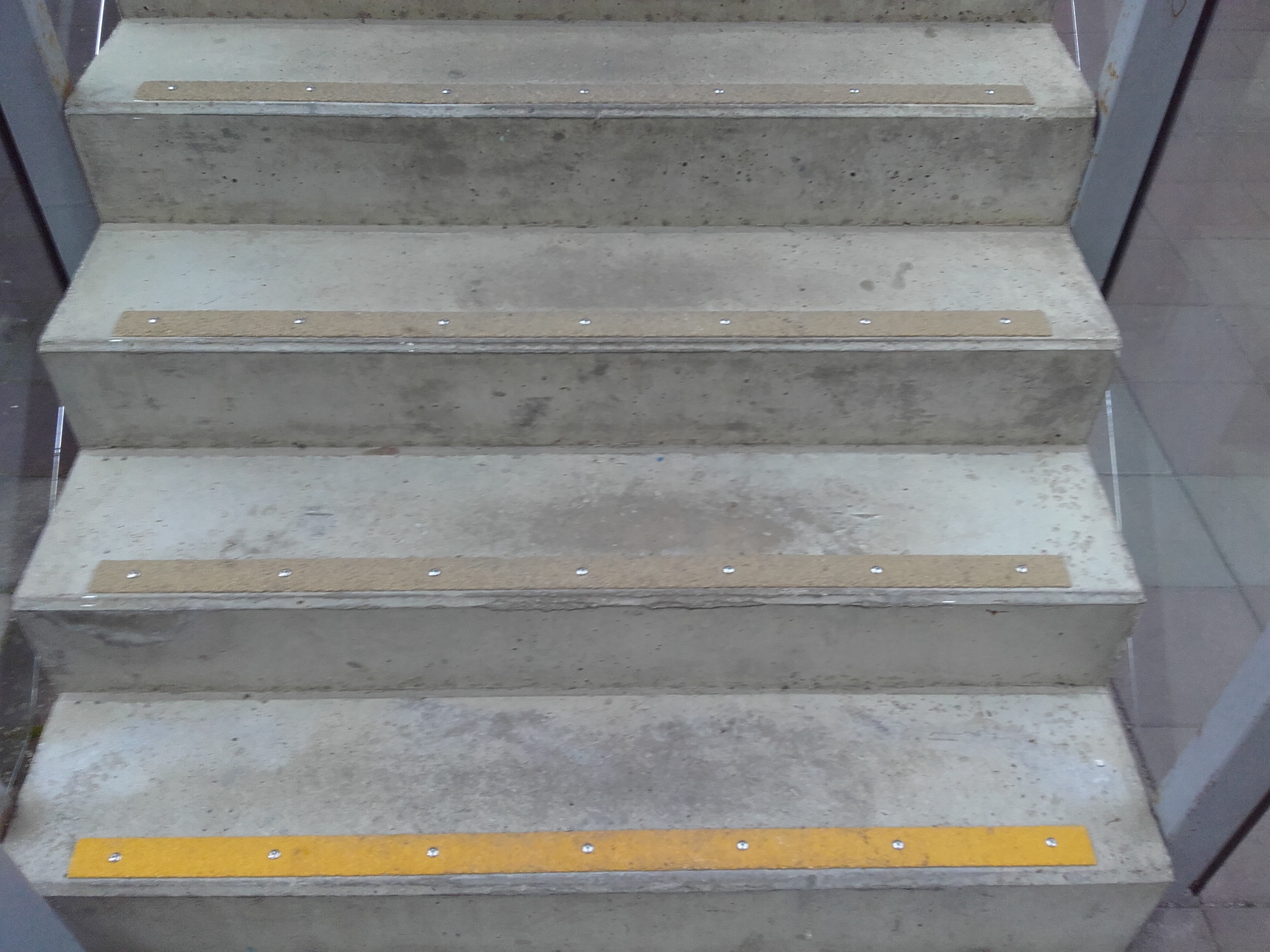 Fibregrid (või samaväärsete toodete*) ribade paigaldus galeriide trepiastmete esiservadesse (ninadesse). Ribade mõõtmed 50mm x1200mm, kinnitada kruvide ja ilmastikukindla mastiksiga. Trepi esimese ja viimase astme kate kollast värvi, ülejäänud hallid.