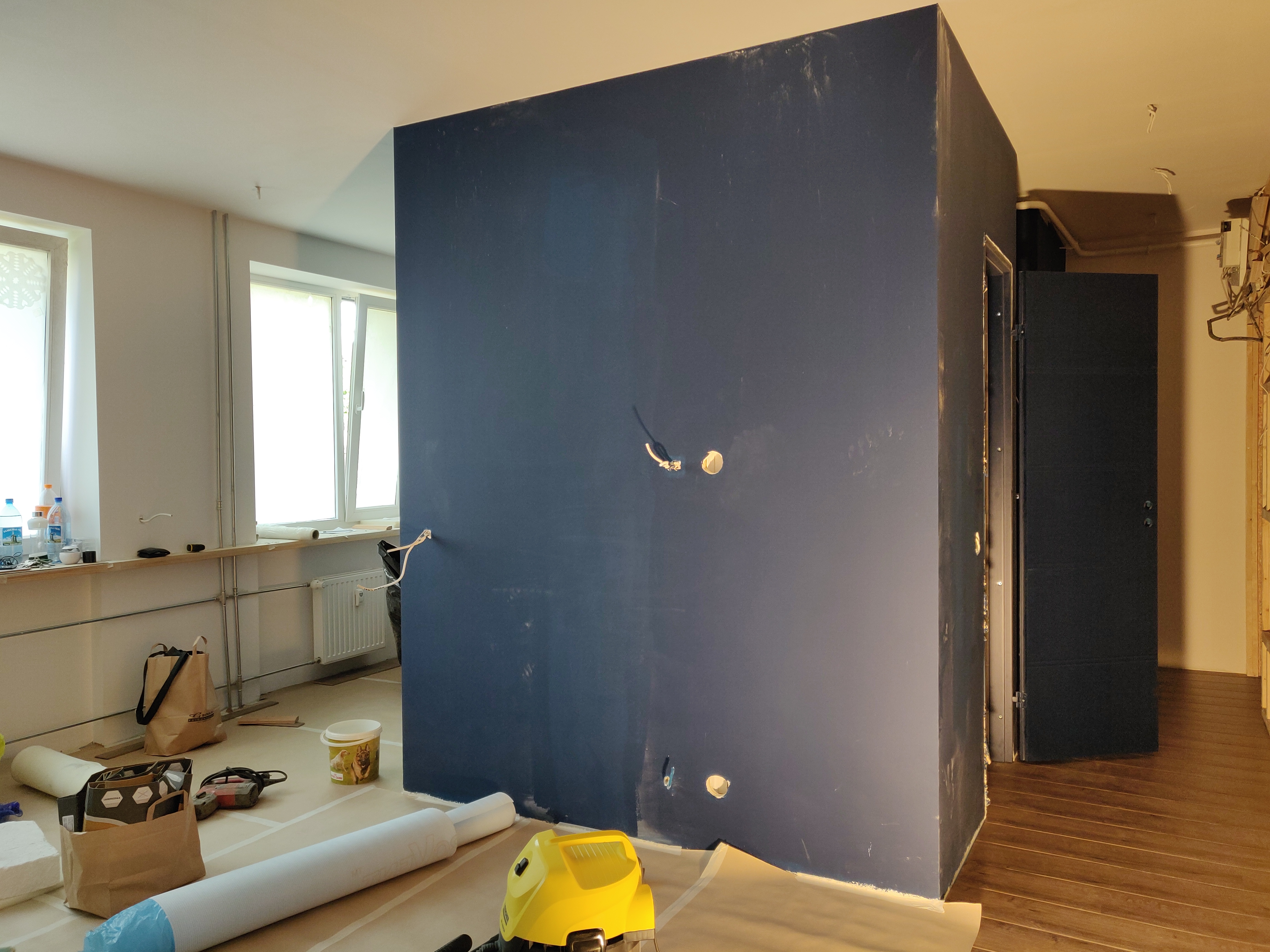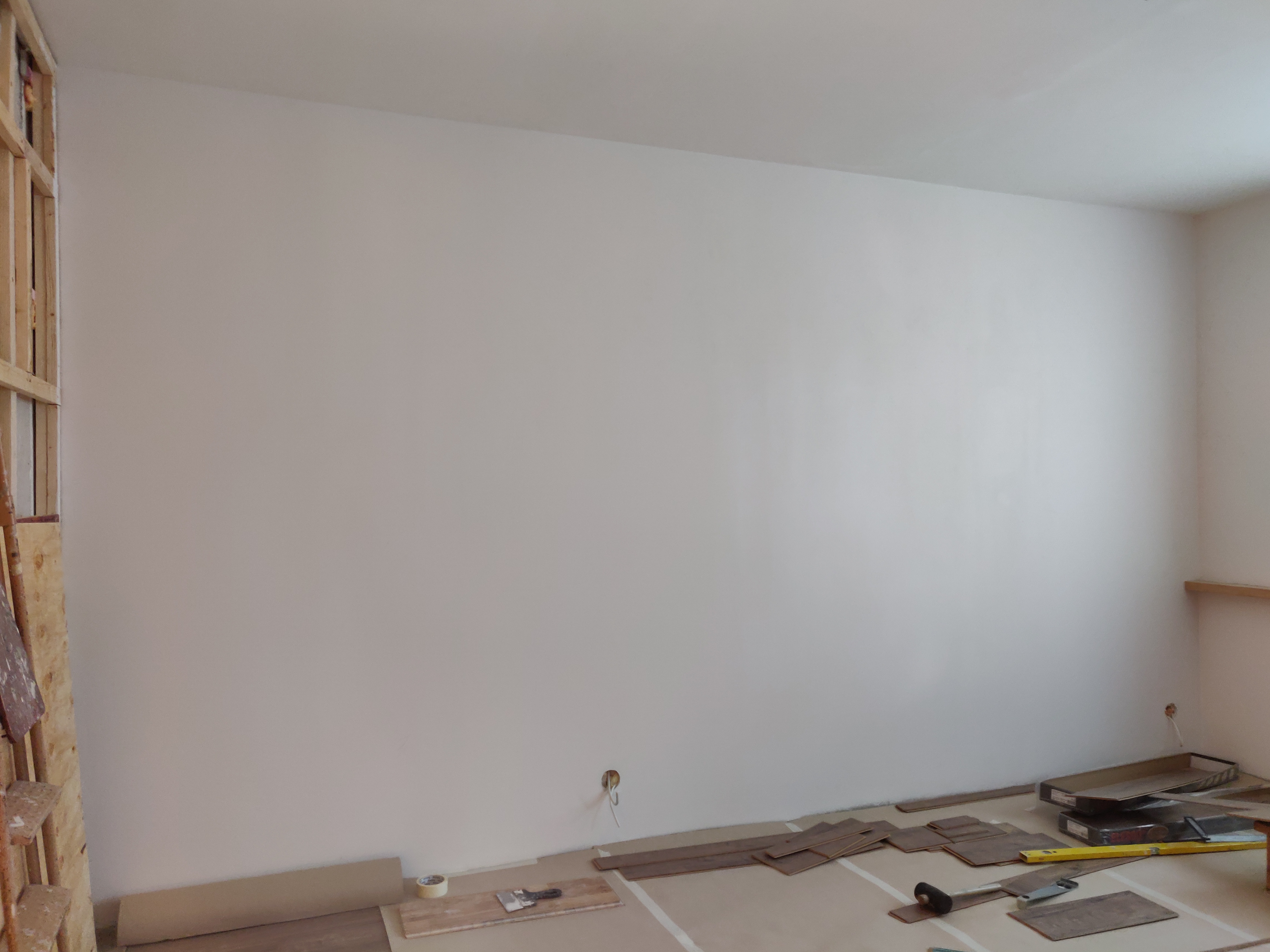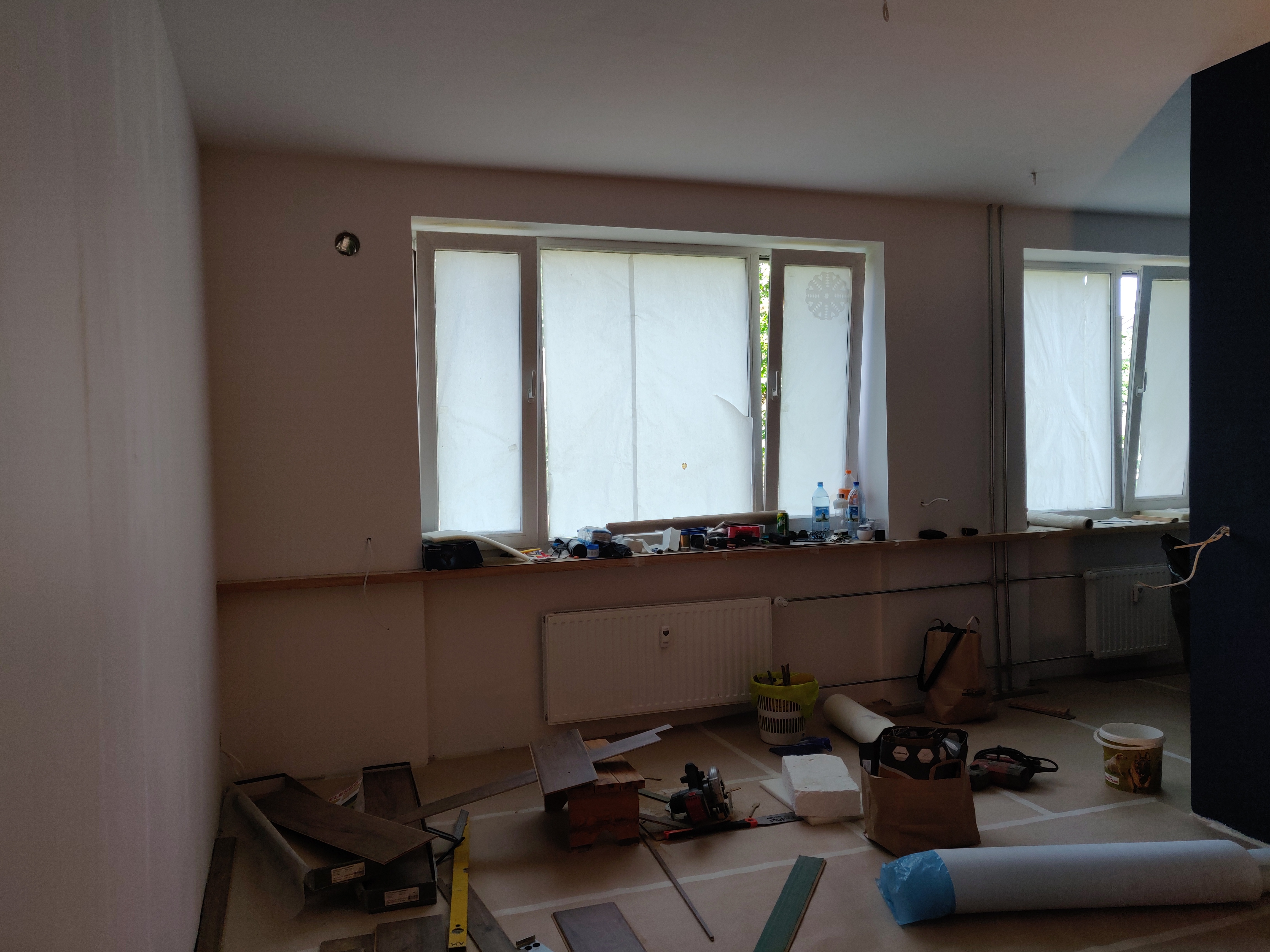 Remont on lõppjärgus, seinad ja lagi on paaril korral üle värvitud, kuid tulemus ebaühtlane. Pinnad vajavad viimast viimistluskihti.