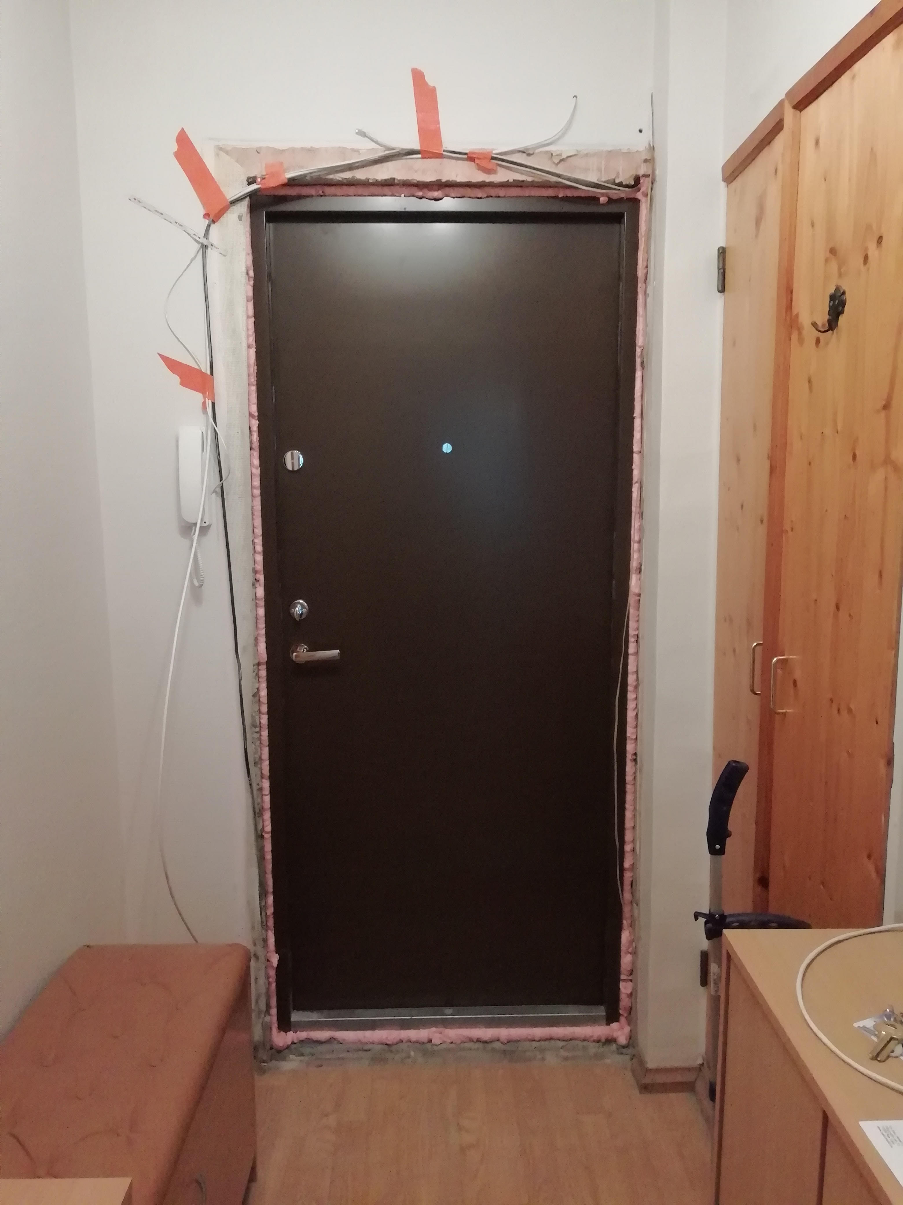 Sooviksin pakkumist korteri välisukse palede viimistlust seest- ja väljastpoolt. Eelnevalt oli seespool ka siseuks, mis eemaldati, lisaks vajaksid juhtmed fikseerimist.