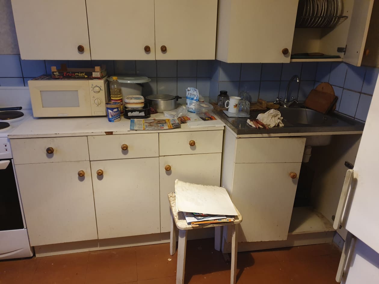 Köögis lõhkuda ja eemaldada vana köögimööbel. Eemaldada vana tapeet ja seinad värvida.