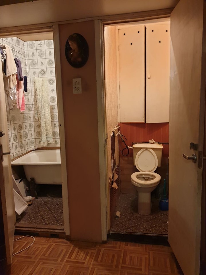 Vannituba ja wc kokku ehitada. Tuua esimene sein ettepoole, et vannituba suuremaks teha. Plaatida, paigaldada uus wc pott, kraanikauss, pesumasin ja vann/dušinurk.