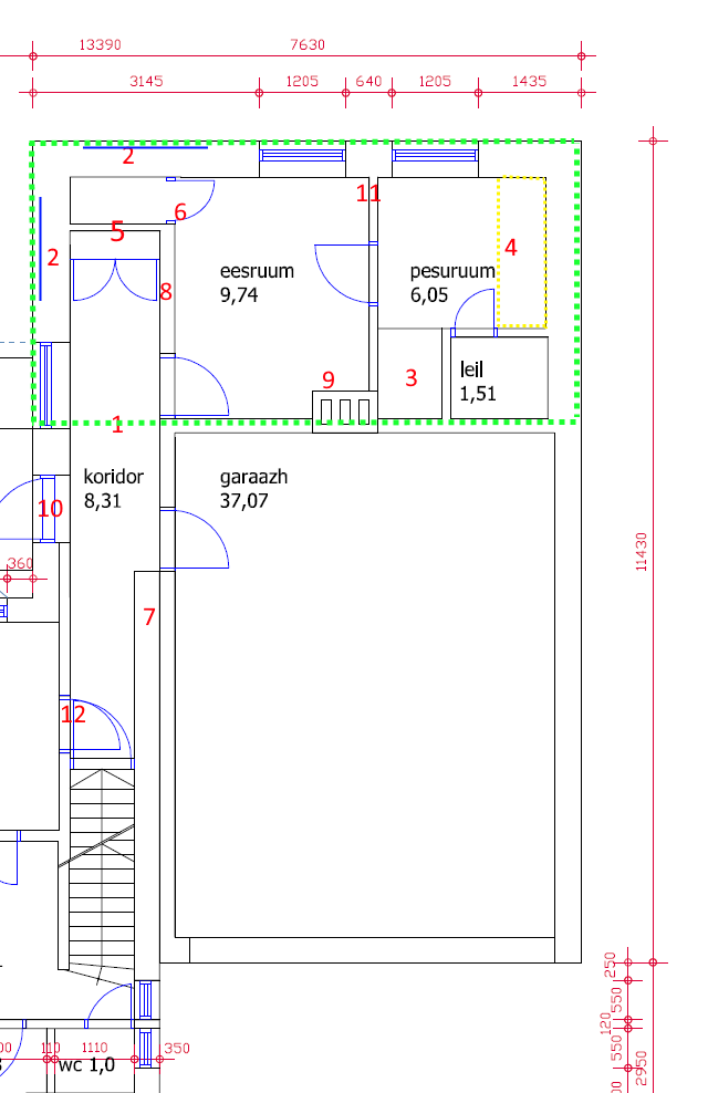 1- koridor - hetkel on seinad teise kujuga, aga number 1 kandis tuleb uus uks (oleks liiga lai, vajab ka miskit lisa-abi-seinakest mõlemal pool. Muud seinad pole tulevases vannitoas (roheline piirjoonega kast) kandvad v.a. koridori ja eesruumi vaheline. Seega võiks paigaldada 20x20cm puust tala (siis läheb muu maja stiiliga kokku) ja seal keskel, number 8 kandis, võiks olla ka post samast materjalist. Tala, post peaks olema viimistletud ehk lihvitud ja äärtest dekoratiivselt ääred süvistatud.