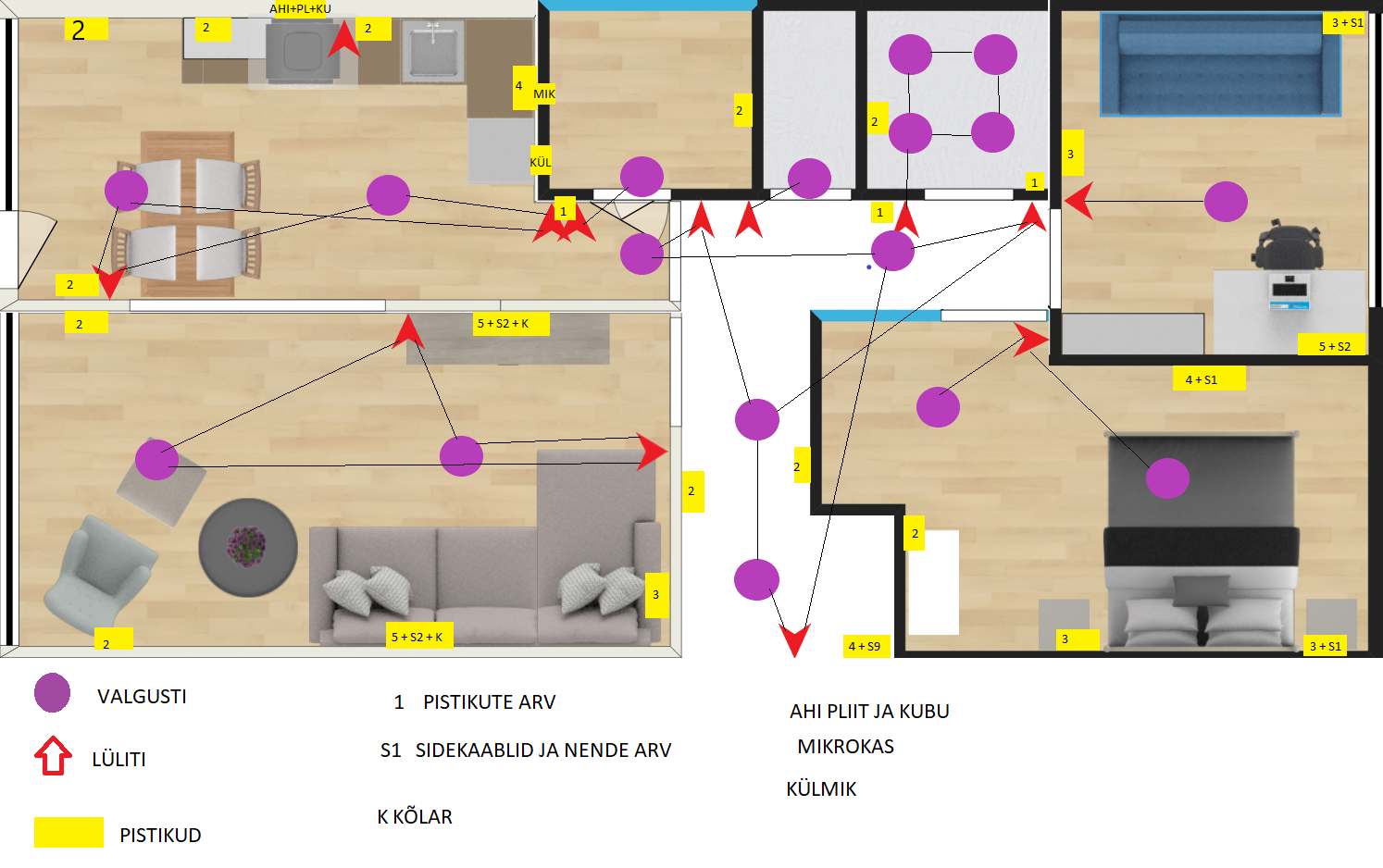 Korteri elektripaigaldise uuendamine vastavalt joonisele. Freesimine ja kaabeldus on võimalik teostada 20-25 jaanuar. Pesade, lülitite ja valgustite paigaldamine kokkulepel peale viimistlustööde lõppu. Lugupidamisega.