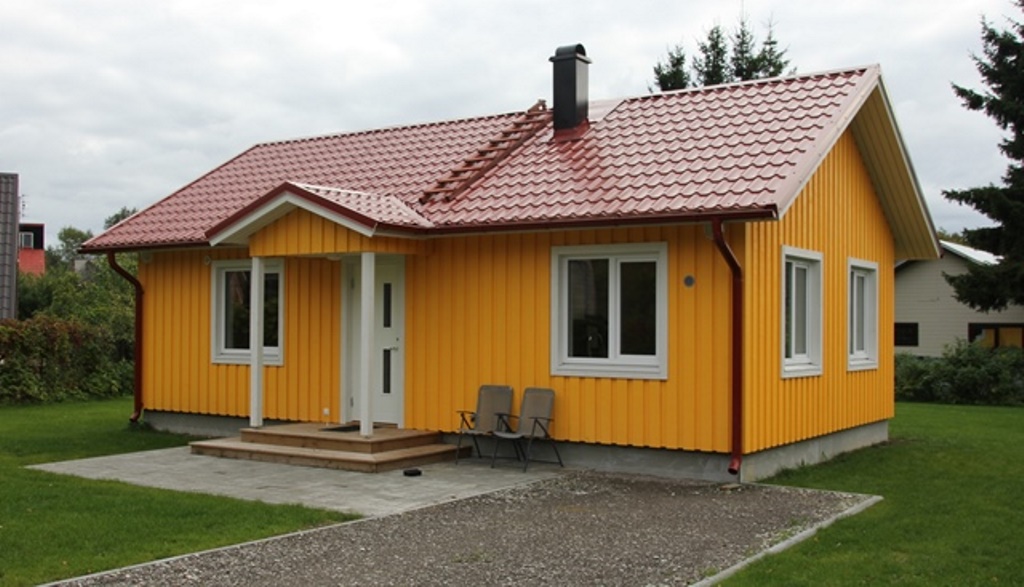 Väikemaja ehitus plaanitud puitkarkassi ja valtsprofiilplekk põhjal . |