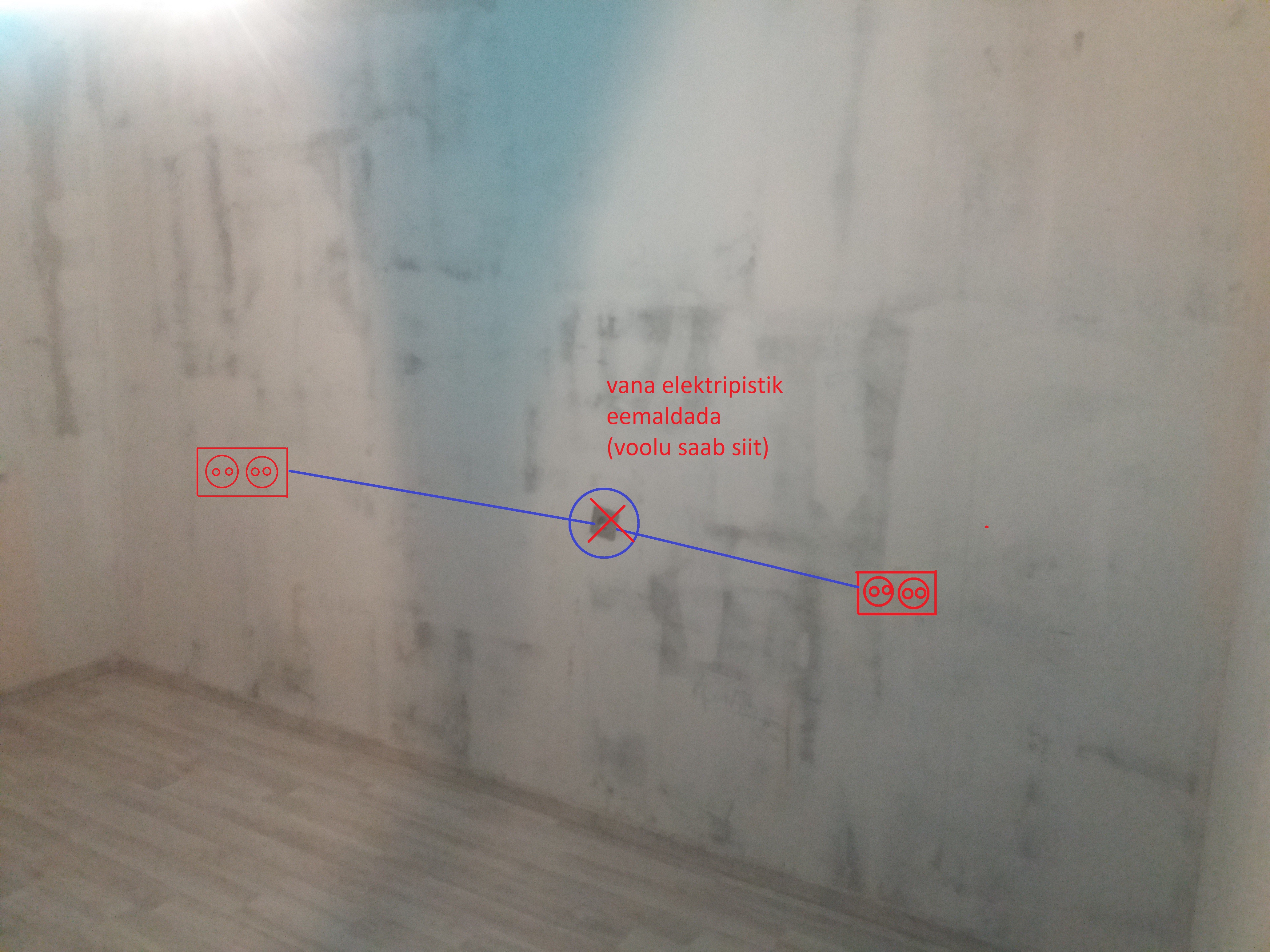 Magamistoas on olemas üks elektripistiku pesa seina keskel, seda soovin kinni panna ja teha uued elektripistiku pesad seina nurkadesse (voodist vasakule ja paremale poole). Elektripistiku pesad mõlemal pool peavad olema kaksikud (pilt on manuses).
