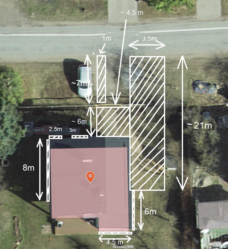 1) Tänavalt eramu territooriumile (läbi liugvärava) auto sissesõidutee (3,5 × ca 21 = ca 73,5 m2);