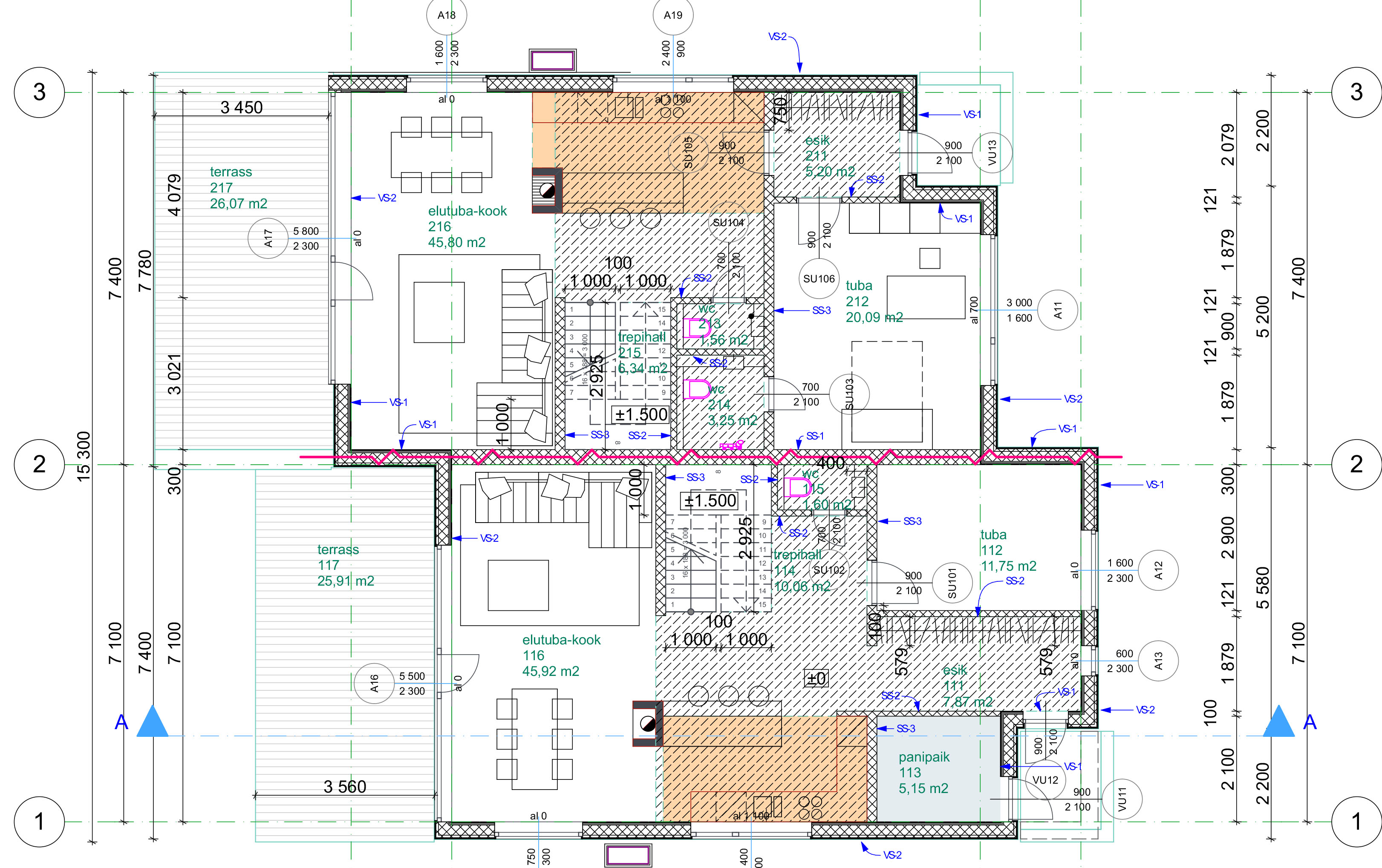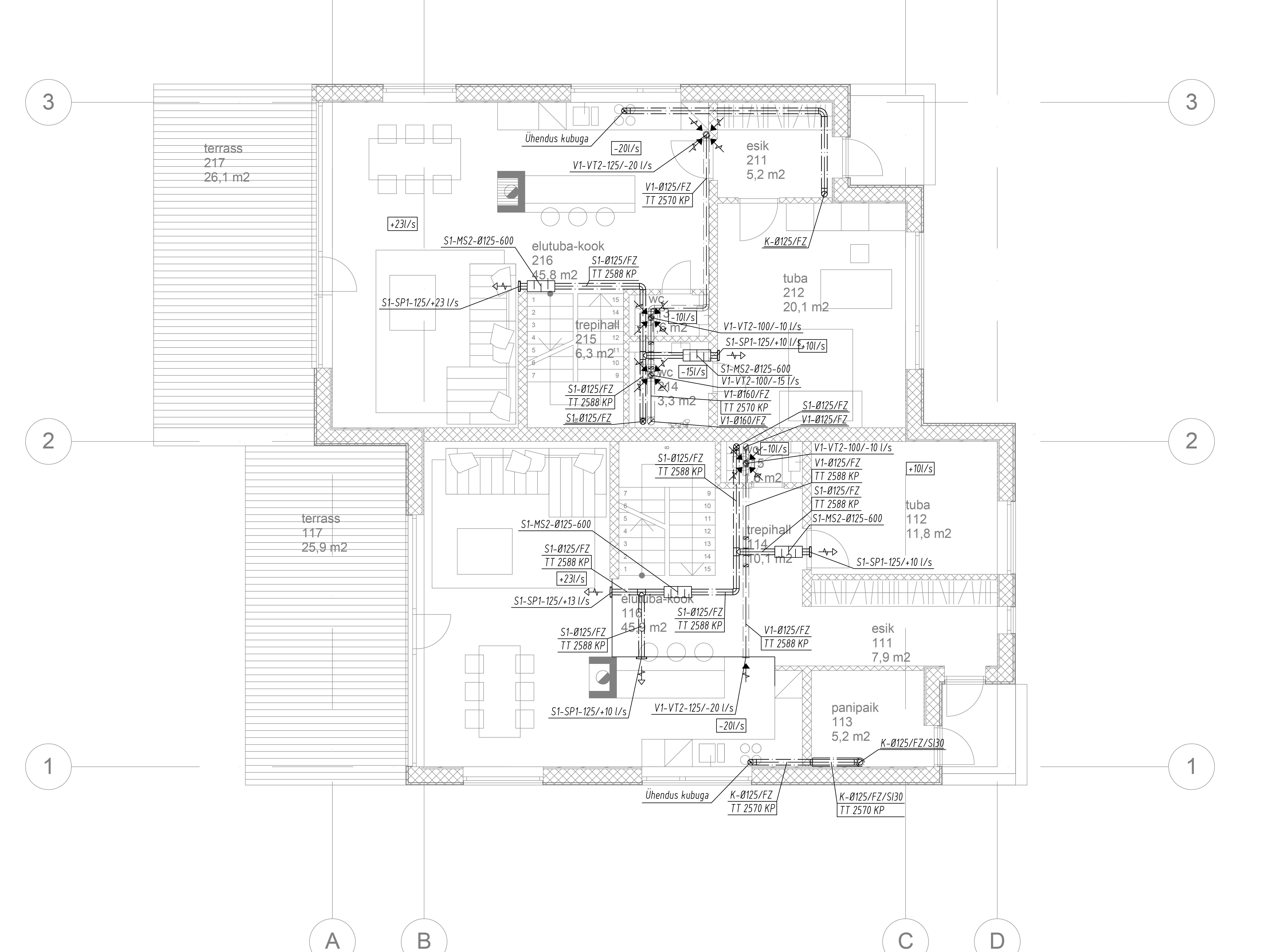 +Ventilatsiooni ja kütteprojektis tuleb tuua agregaadid tuleb tuua esimesed korruse tehnoruumi.