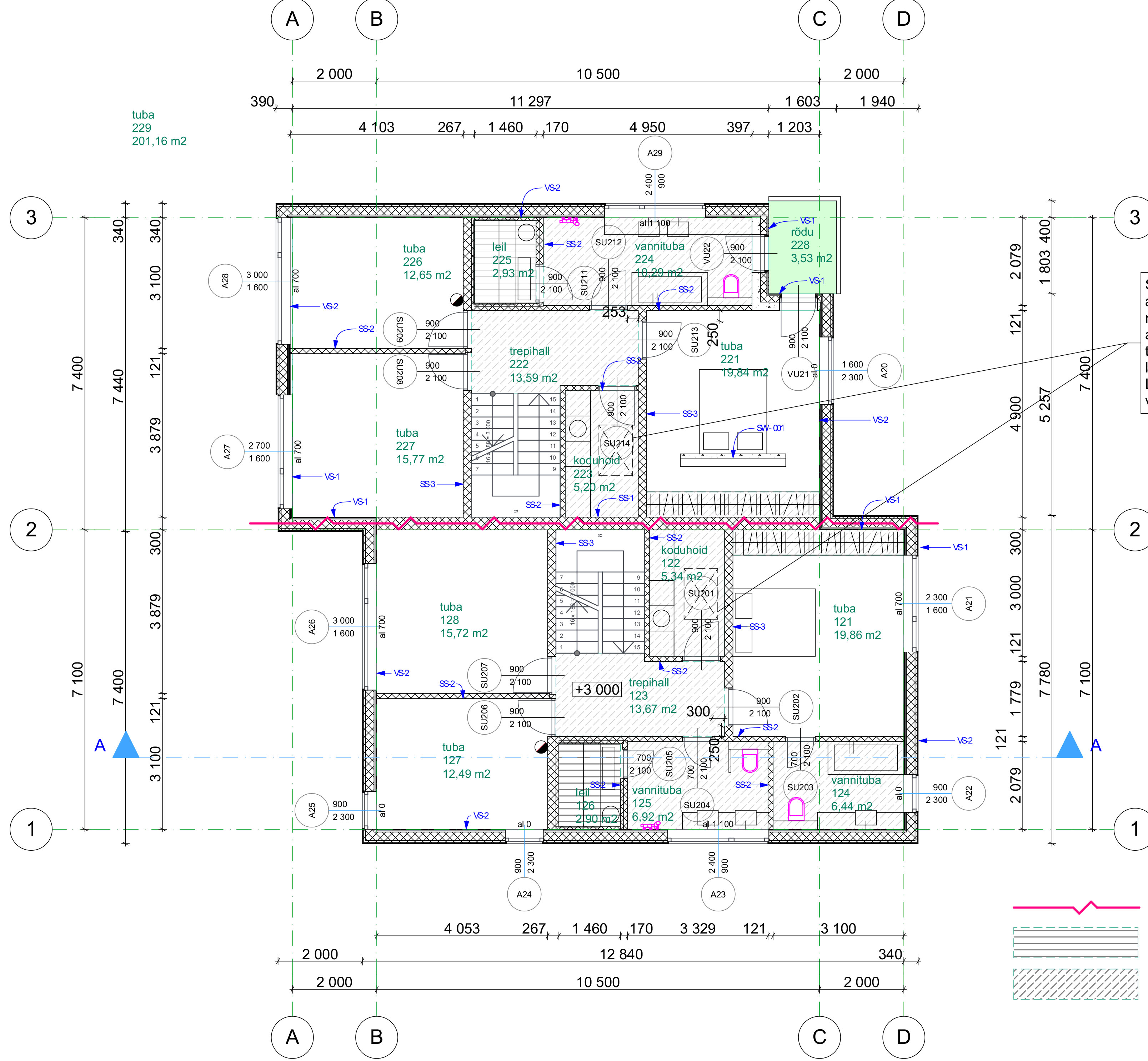 + Esimese korruse vahelae kõrguse viimine kooskõlla eluruumi nõuetega(2,5 m) Üks võimalikest lahendustest on asendada osaliselt talad 300 mm puitmetalltaladega(kanal ja vent. tõttu on planeeritud kõrgus 2,3 m).