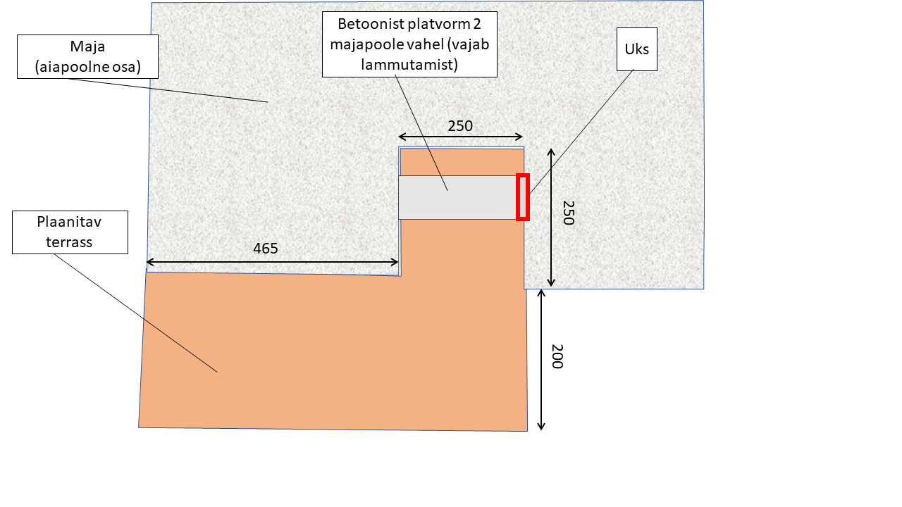 Terrassi ja varikatuse ehitus. Terrassi kuju ja mõõte vt jooniselt, enne ehitust on vaja lammutada kahe majapoole vahel asuv betoonist platvorm ja trepp (varem on ilmselt platvormi mõlemas otsas olnud uks, praegu ainult ühes otsas; platvorm ei ole maja vundamendiga kokku ehitatud, vaid eraldi mitmes järgus valatud). Terrassi servas kogu ulatuses madalam aste (tavalise trepiastme laiuselt). Materjal: immutatud puit.