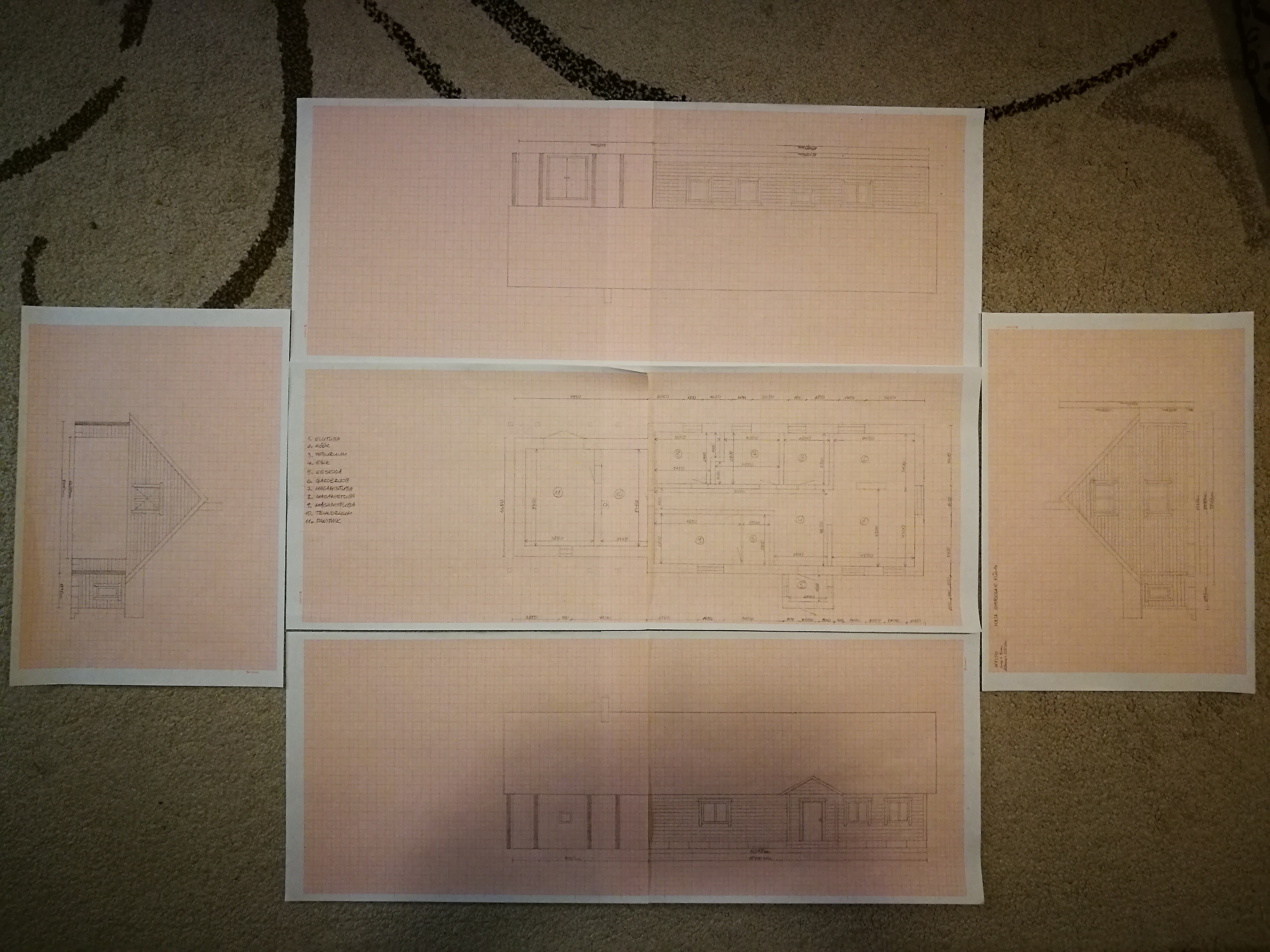 Manusest leiate vana elamu plaani, geodeetilise alusplaani ja enda visooni uuest majast. Täpsustaks oma tehtud vaadetest nii palju, et näiteks PÕHIPLAAN1 ja PÕHIPLAAN2 käivad kõrvuti. Samuti on külgvaadetega.