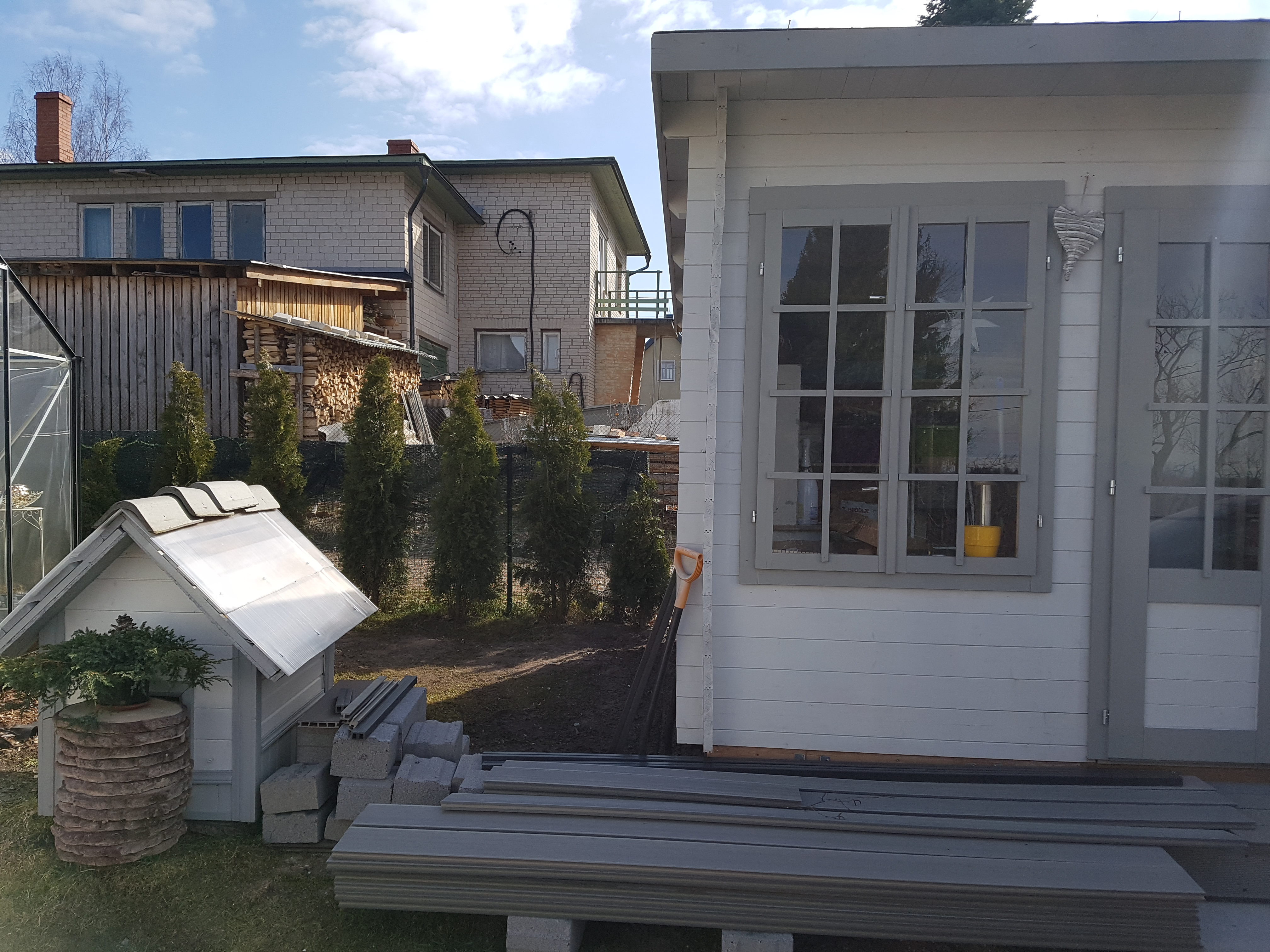 Terrassi ehitamine plokkidele 2,5m x 3m, mille peale tagaseinaga varikatuse juurdeehitus aiamajale.