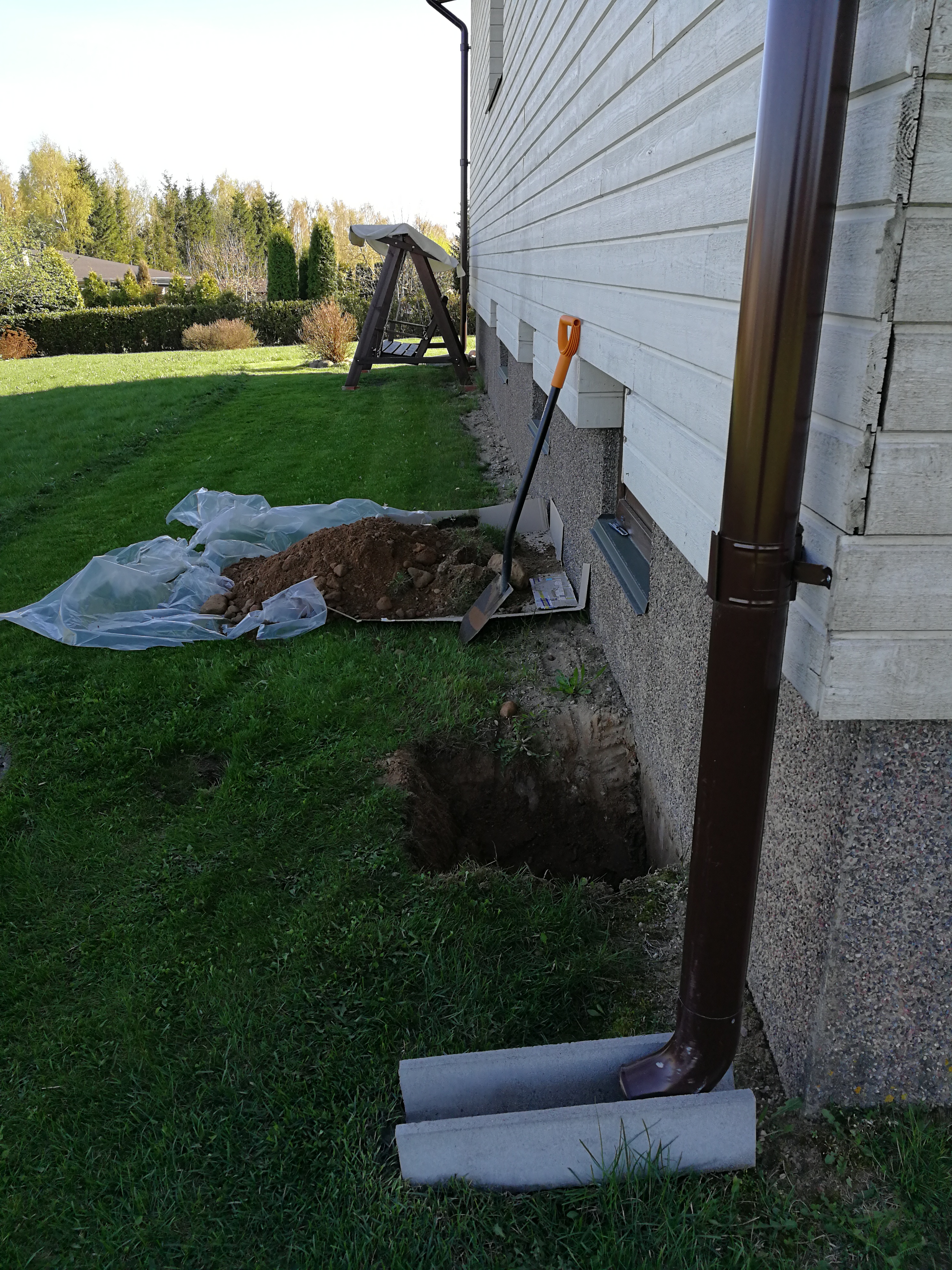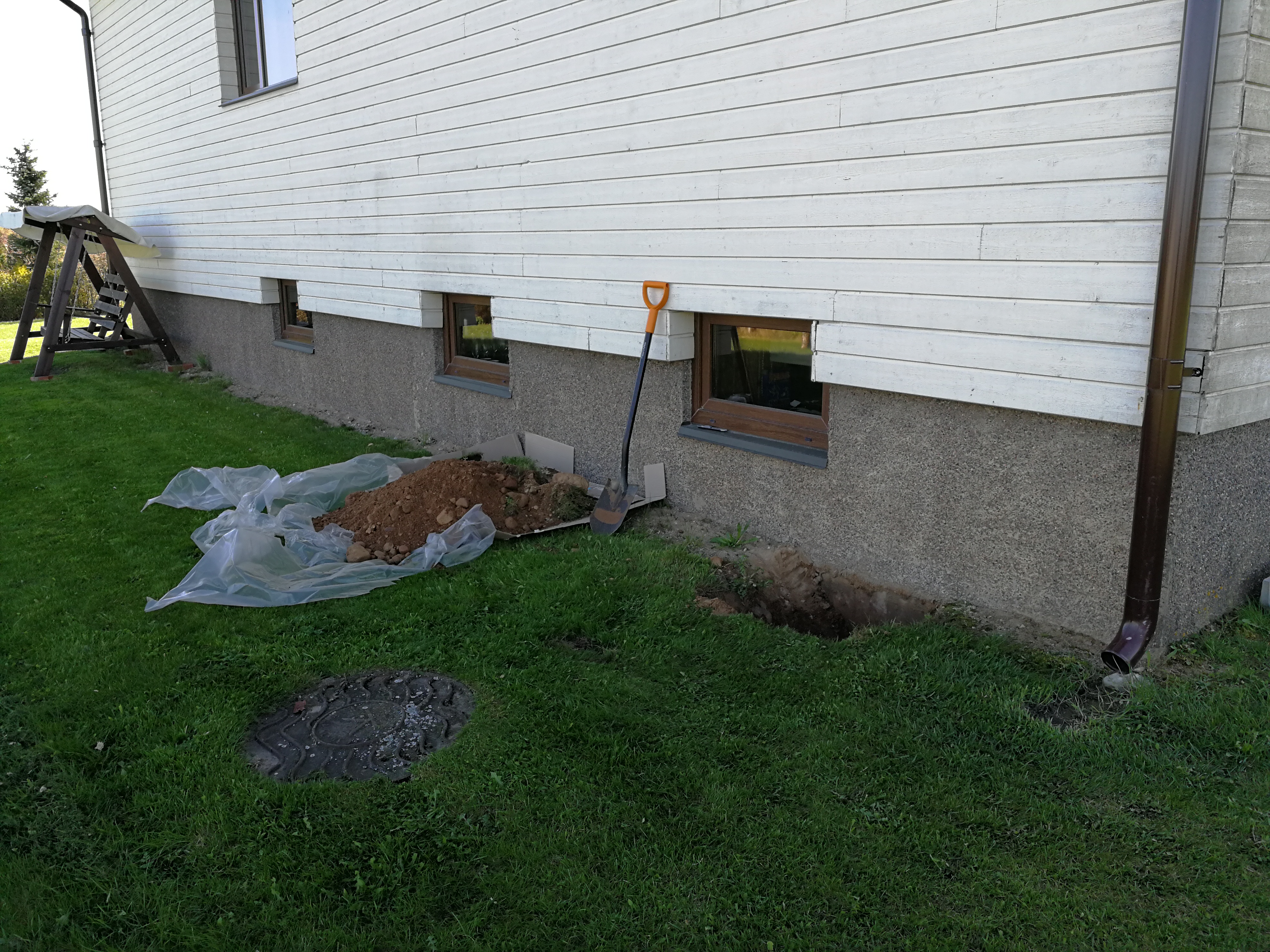 Lühema külje peal on maja seinast ca 1,5m kaugusel maakütte trass. Väga laialt lahti kaevata ei saa.