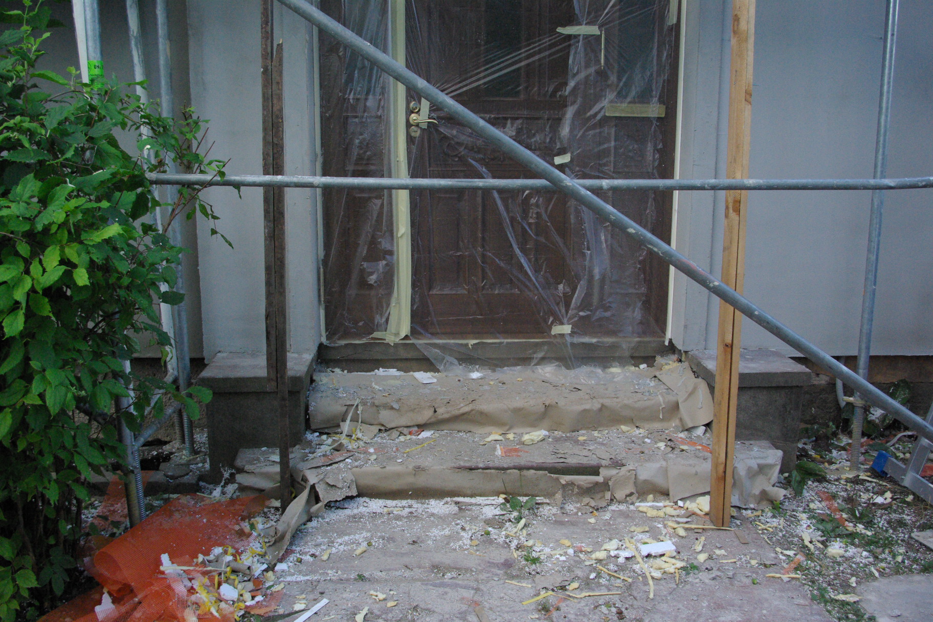 Seoses ukse ettepoole toomisega vaja ka trepp ca 70 cm ette "nihutada". Ehk siis ehitada betoonist kolme astega trepp, viimane (ukse juures olev) aste ca 70 cm lai. Trepi laius 2.5 m. Uus trepp peab siduma olemasoleva vana trepiga.