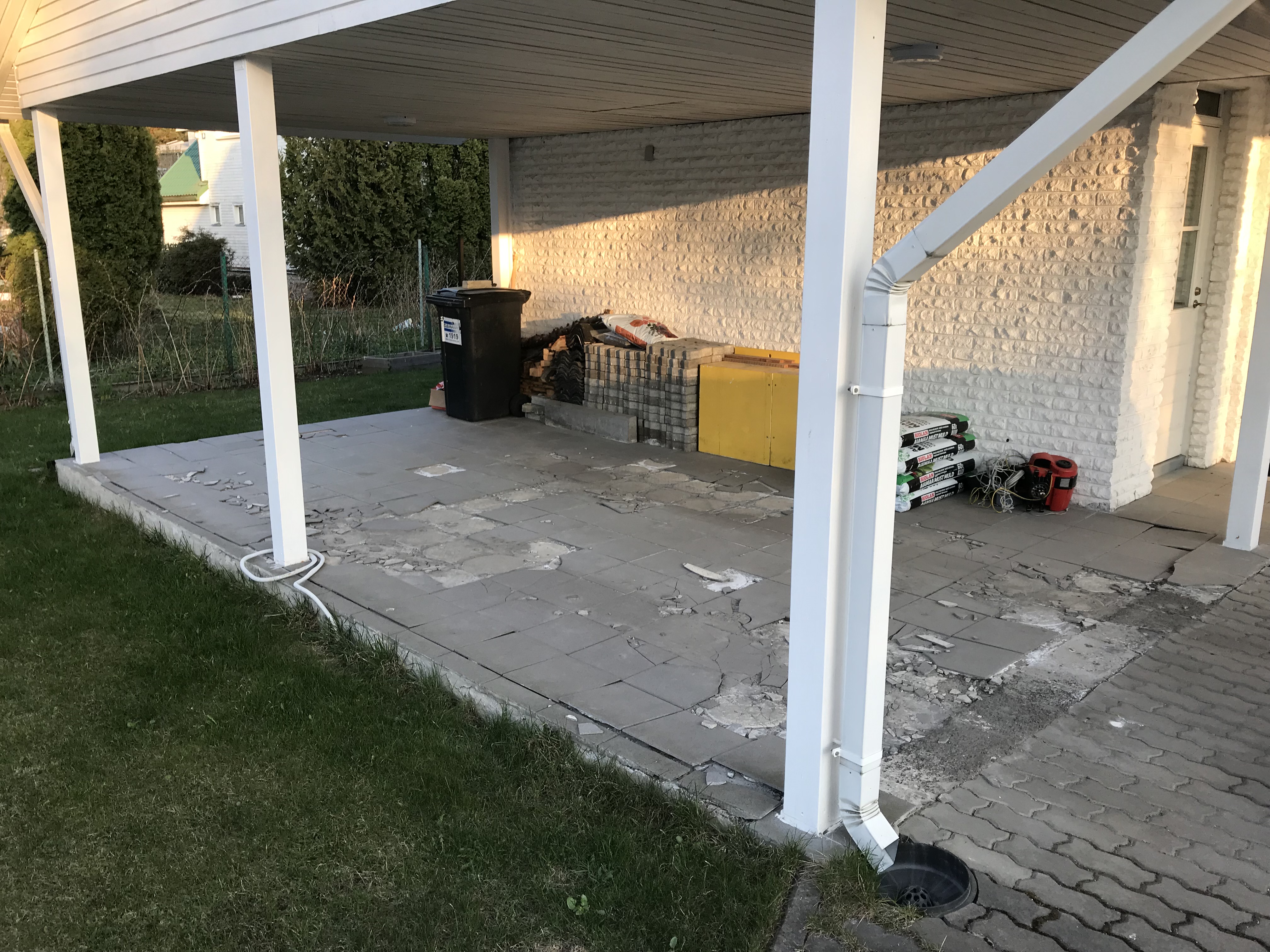 Vaja oleks üles võtta ja utiliseerida vana ja vajunud auto katusealuse (24m2) põrand ning valada uus põrand. Vaja käia üle ka kopteriga kuna lõpptulemus peaks jääma tolmuvaba ja sile. Astet üleminekul tänavakivile ei tohiks samuti jääda. Samuti tuleks kandepostid isoleerida betoonist.