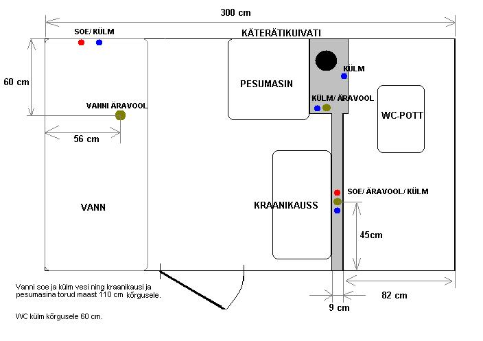Vannitoas maas peno. Peno sisse oleks vaja vedada veetorud vannile, kraanikausile, pesumasinale ja wc potile. Äravoolu torud vaja panna vannile, pesumasinale ja kraanikausile.