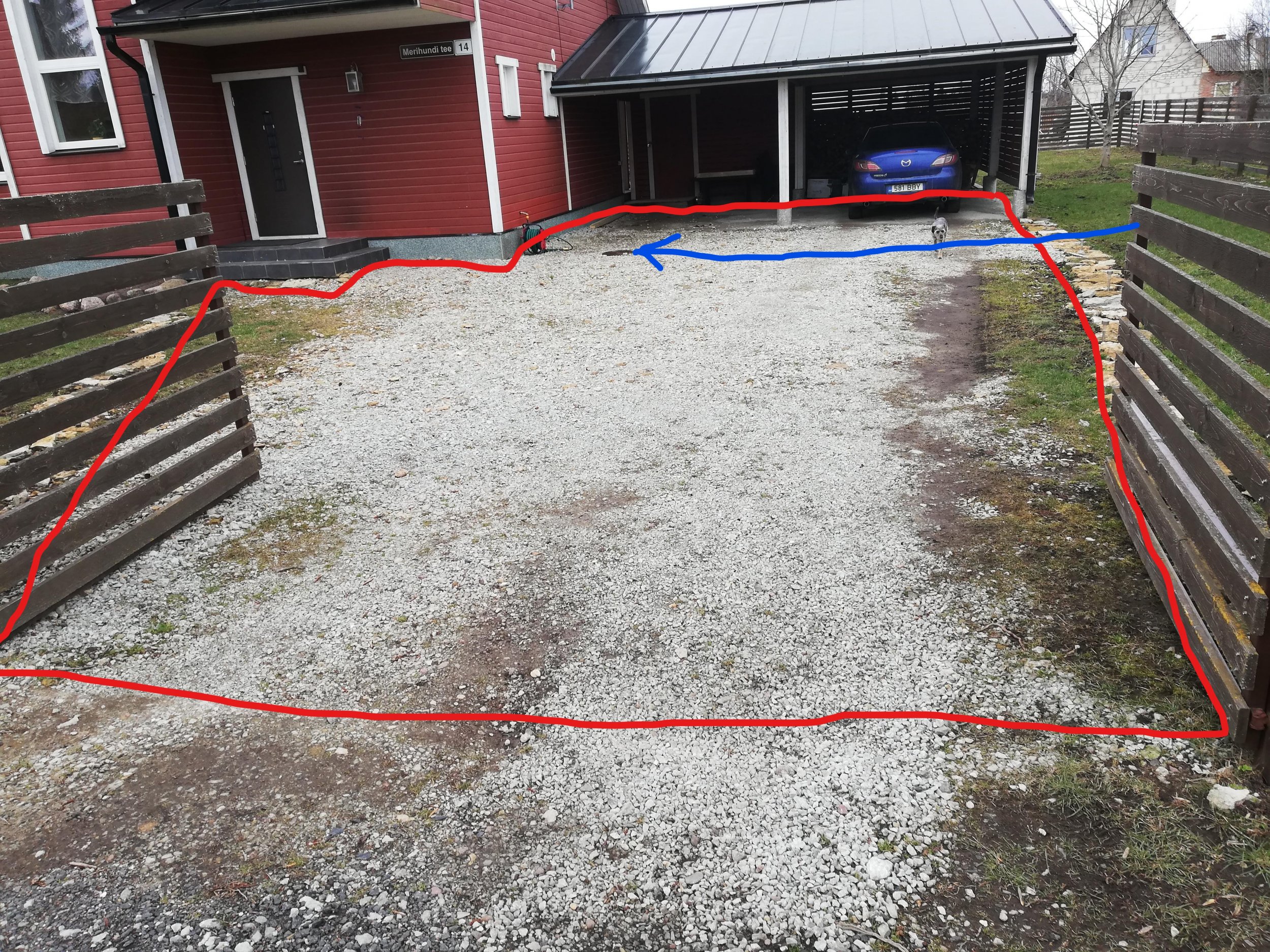 Soov kogumismahuti tagant lahti ühendada saunakanal ja tuua see maja tsentraalsesse kanalisatsiooni. Pildil märgitud sinine joon + peale seda, korrastatada killustikuga eramu sissesõidu tee, mis on ca 140m2.