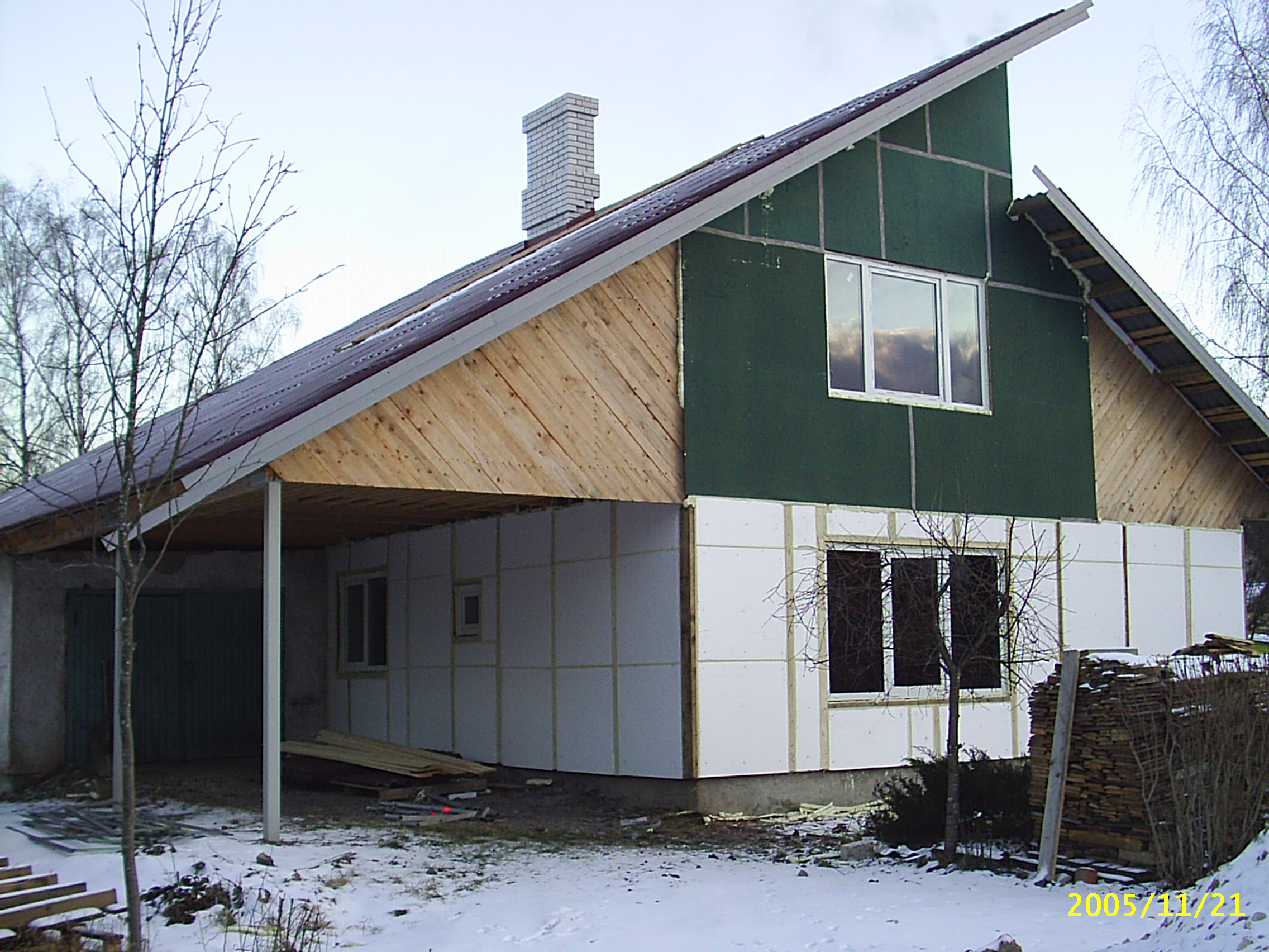 Alusroovi rihtimine ja välisvoodrilaua paigaldus (215m2); tuulekastide ehitus (65jm), aknakossid, varjualuste lagede katmine musta lauaga (43m2).