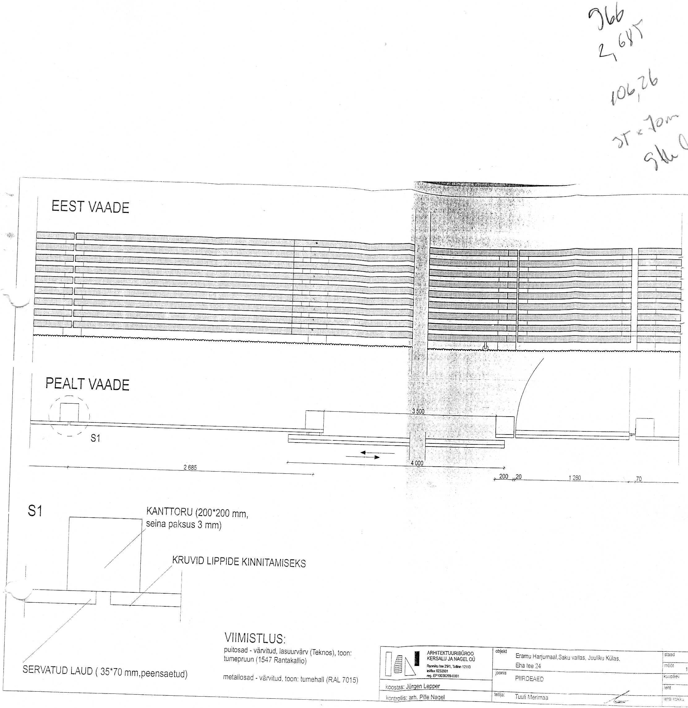 Väravad: Autole lükandvärav kõrgus 1,1m kogupikkusega 4m, millest tegelik postide vahe 3,5m. Jalgvärav kõrgusega 1,1m ja laiusega 1,26m. Väravad peaksid olema väliselt identsed aiaga.