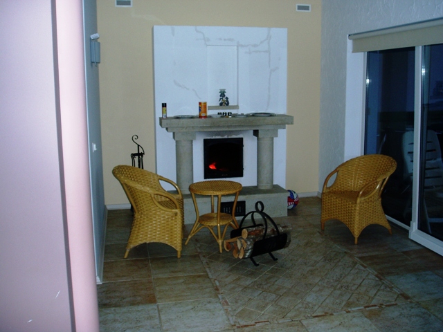 Olemasoleva kamina pinna taastuskrohvimine ja taustseinaks oleva seina ladumine murtud silikaadi immitatsioonkivist, seinale liimides.
